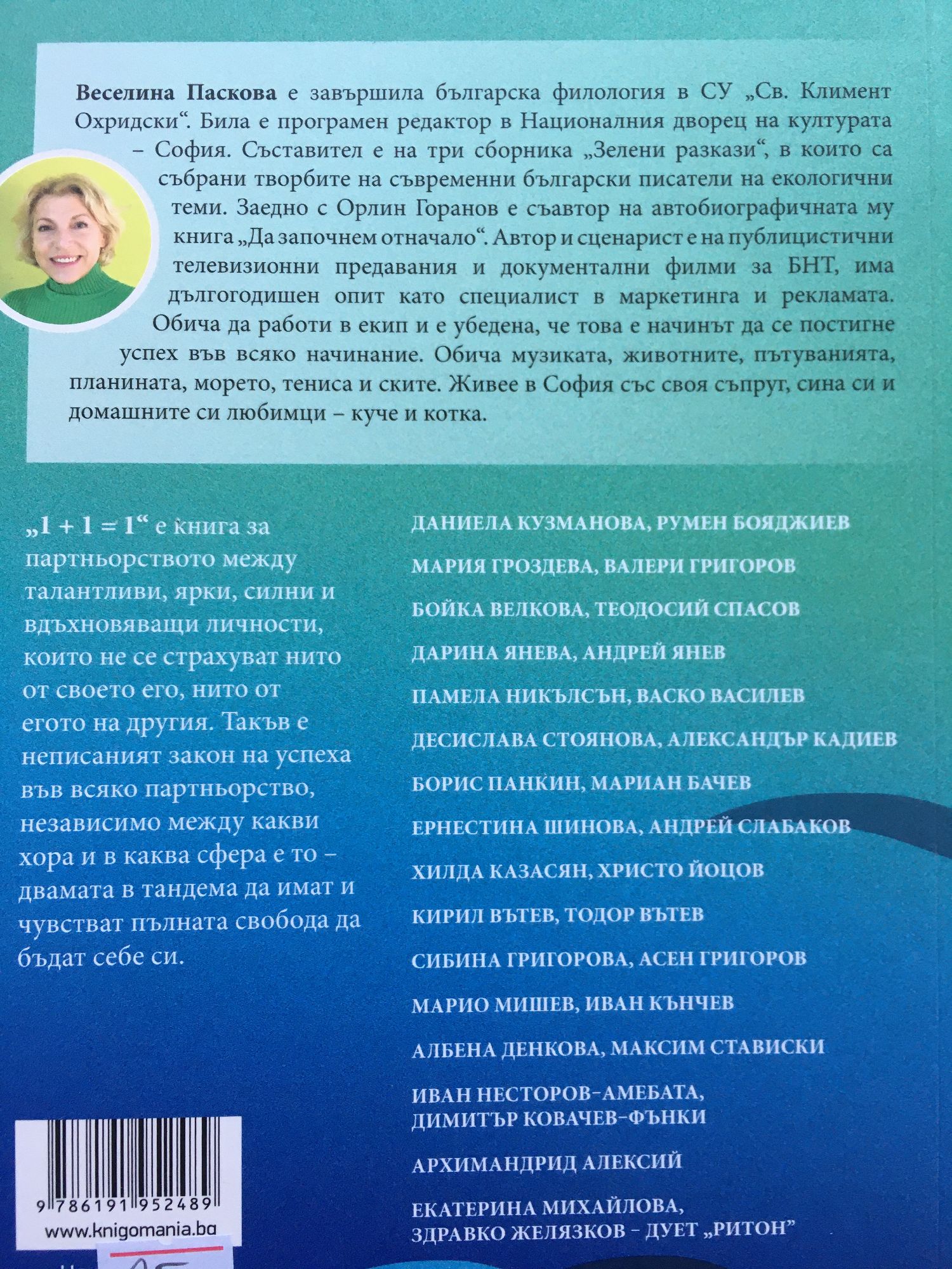 „1 + 1 = 1“ е книга за партньорството между талантливи, ярки, силни и вдъхновяващи личности, които не се страхуват нито от своето его, нито от егото на другия. Такъв е неписаният закон на успеха във всяко партньорство, независимо между какви хора и в каква сфера е то – двамата в тандема да имат и чувстват пълната свобода да бъдат себе си. ДАНИЕЛА КУЗМАНОВА, РУМЕН БОЯДЖИЕВ МАРИЯ ГРОЗДЕВА, ВАЛЕРИ ГРИГОРОВ БОЙКА ВЕЛКОВА, ТЕОДОСИЙ СПАСОВ ДАРИНА ЯНЕВА, АНДРЕЙ ЯНЕВ ПАМЕЛА НИКЪЛСЪН, ВАСКО ВАСИЛЕВ ДЕСИСЛАВА СТОЯНОВА, АЛЕКСАНДЪР КАДИЕВ БОРИС ПАНКИН, МАРИАН БАЧЕВ ЕРНЕСТИНА ШИНОВА, АНДРЕЙ СЛАБАКОВ ХИЛДА КАЗАСЯН, ХРИСТО ЙОЦОВ КИРИЛ ВЪТЕВ, ТОДОР ВЪТЕВ СИБИНА ГРИГОРОВА, АСЕН ГРИГОРОВ МАРИО МИШЕВ, ИВАН КЪНЧЕВ АЛБЕНА ДЕНКОВА, МАКСИМ СТАВИСКИ ИВАН НЕСТОРОВ – АМЕБАТА, ДИМИТЪР КОВАЧЕВ – ФЪНКИ АРХИМАНДРИД АЛЕКСИЙ ЕКАТЕРИНА МИХАЙЛОВА, ЗДРАВКО ЖЕЛЯЗКОВ – ДУЕТ „РИТОН”
