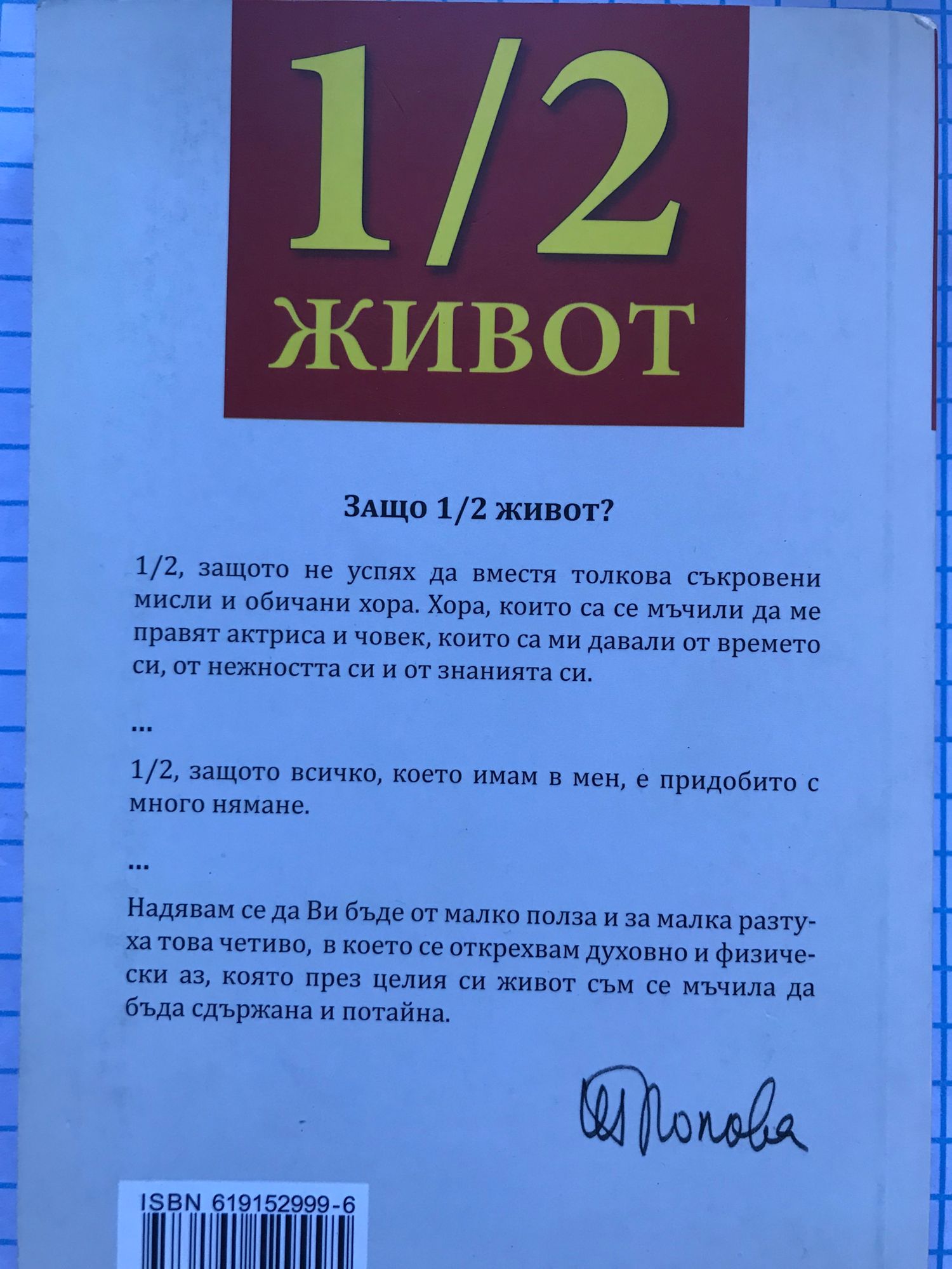 Защо 1/2 живот? 1/2, защото не успях да вместя толкова съкровени мисли и обични хора. Хора, които са се мъчили да ме правят актриса и човек, които са ми давали от времето си, от нежността си и от знанията си. 1/2, защото всичко, което имам в мен, е придобито с много нямане. Надявам се да Ви бъде от малко полза и за малка разтуха това четиво, в което се открeхвам духовно и физически аз, която през целия си живот съм се мъчила да бъда сдържана и потайна.