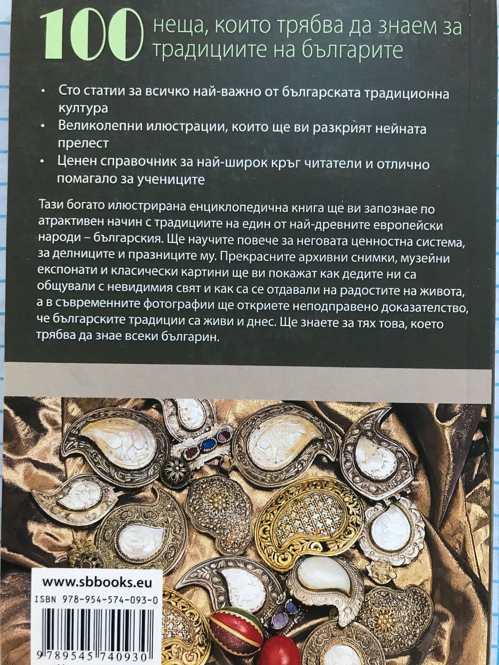 Тази богато илюстрирана енциклопедична книга ще ви запознае по атрактивен начин с традициите на един от най-древните европейски народи – българския. Ще научите повече за неговата ценностна система, за делниците и празниците му. Прекрасните архивни снимки, музейни експонати и класически картини ще ви покажат как дедите ни са общували с невидимия свят и как са се отдавали на радостите на живота, а в съвременните фотографии ще откриете неподправено доказателство, че българските традиции са живи и днес. Ще знаете за тях това, което трябва да знае всеки българин. Сто статии за всичко най-важно от българската традиционна култура Великолепни илюстрации, които ще ви разкрият нейната прелест Ценен справочник за най-широк кръг читатели и отлично помагало за учениците