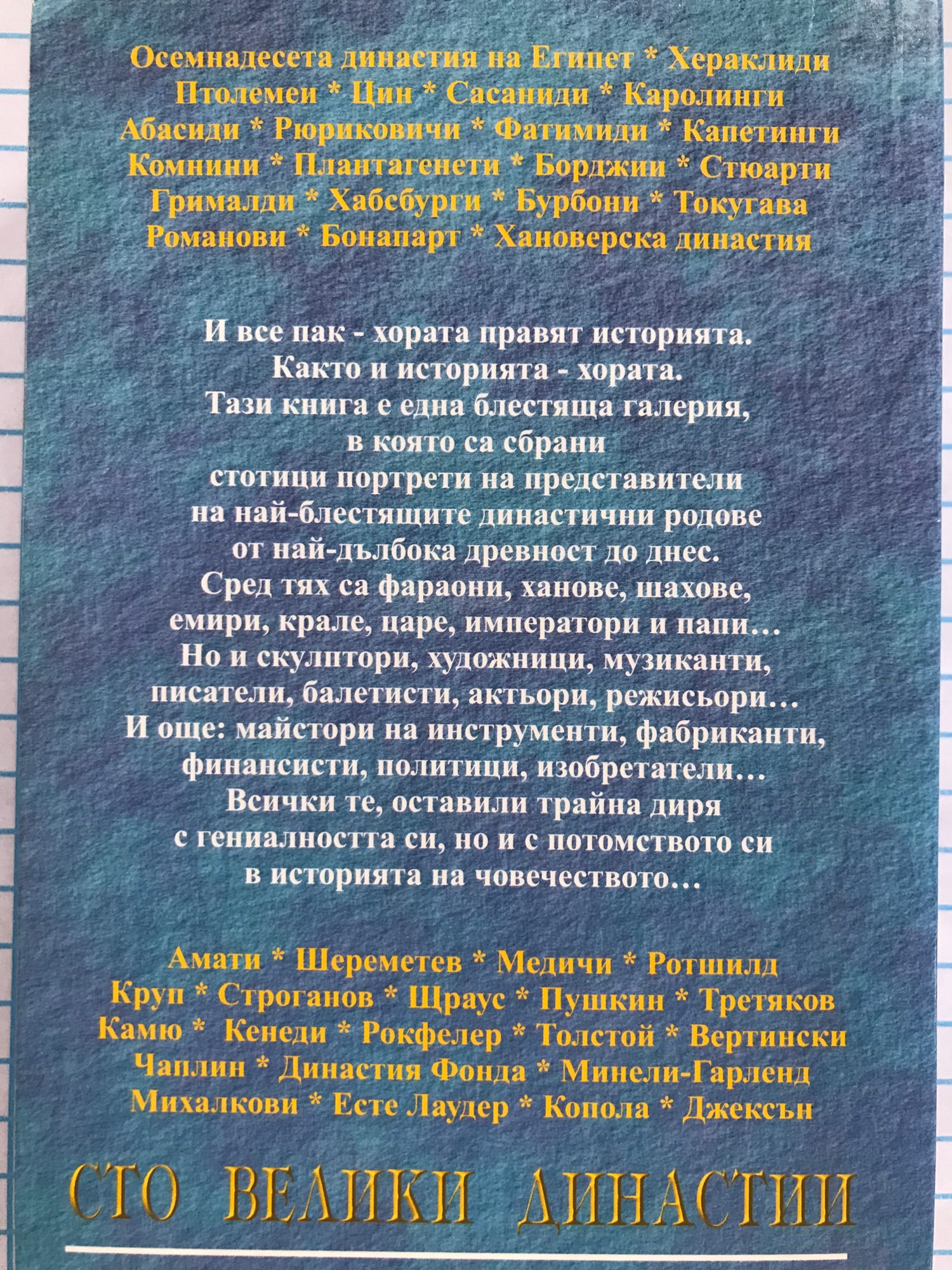 И все пак - хората правят историята. Както и историята - хората. Тази книга е една блестяща галерия, в която са сбрани стотици портрети на представители на най-блестящите династични родове от най-дълбока древност до днес. Сред тях са фараони, ханове, шахове, емири, крале, царе, императори и папи... Но и скулптори, художници, музиканти, писатели, балетисти, актьори, режисьори... И още: майстори на инструменти, фабриканти, финансисти, политици, изобретатели... Всички те, оставили трайна диря с гениалността си, но и с потомството си в историята на човечеството...
