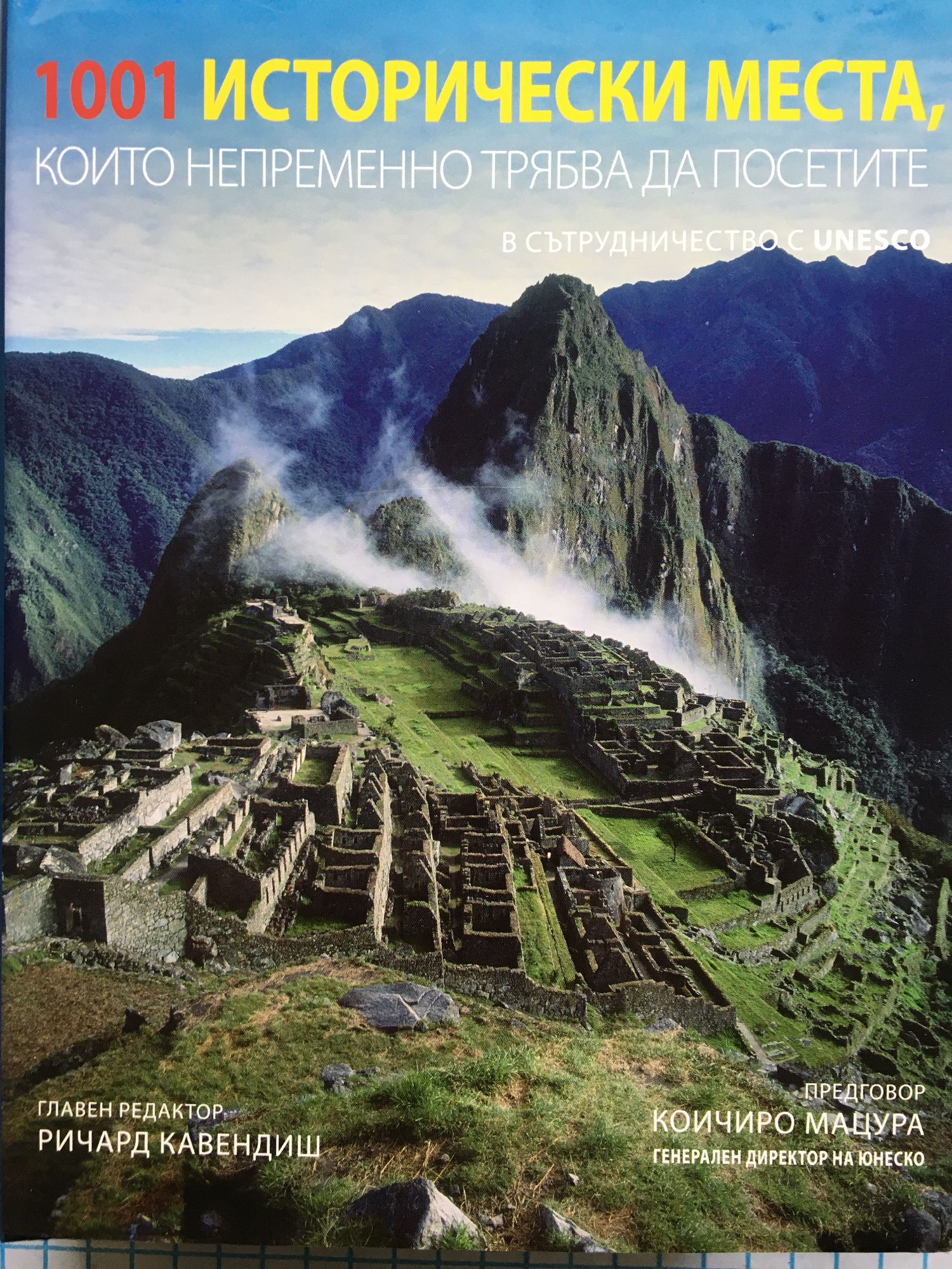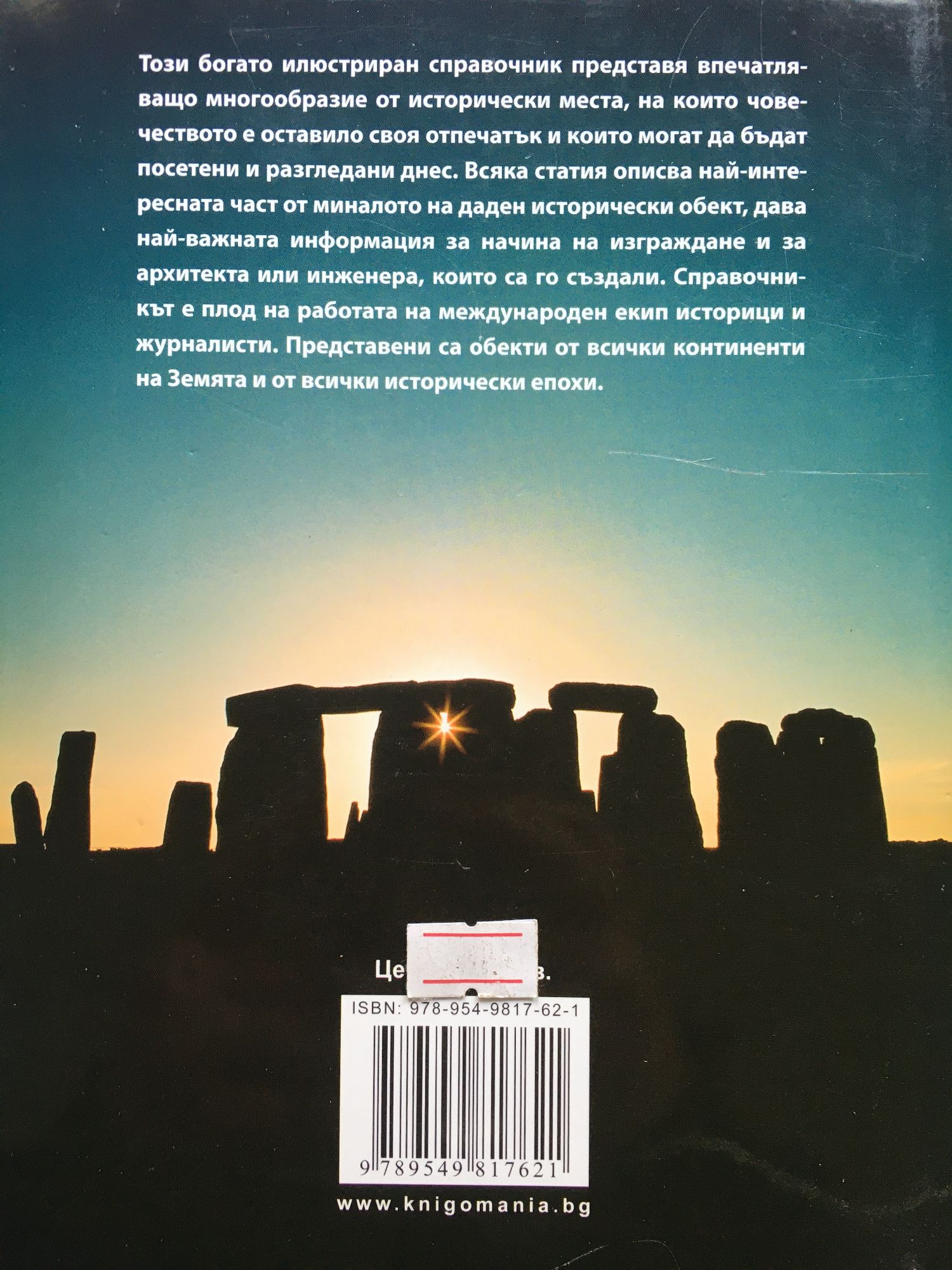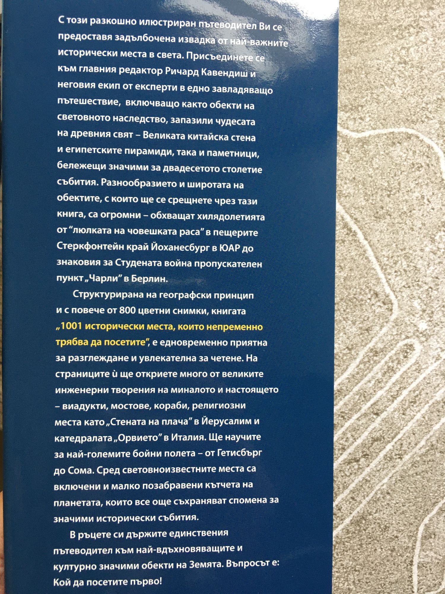 Този разкошно илюстриран справочник представя най-важните исторически места в света. Той включва обекти на Световното наследство съхранили чудесата на древния свят, като Великата китайска стена и Египетските пирамиди и мемориали, отбелязващи най-важните събития на ХХ в. На страниците му ще намерите много от великите инженерни творения на миналото и настоящето – виадукти, мостове, кораби, религиозни места и други. Включени са и някои позабравени кътчета на планетата, които носят наследството на важни исторически събития. В ръцете си държите единствения справочник, представящ най- вдъхновяващите, културно значими обекти на Земята. Вие ще изберете кой да посетите първо.