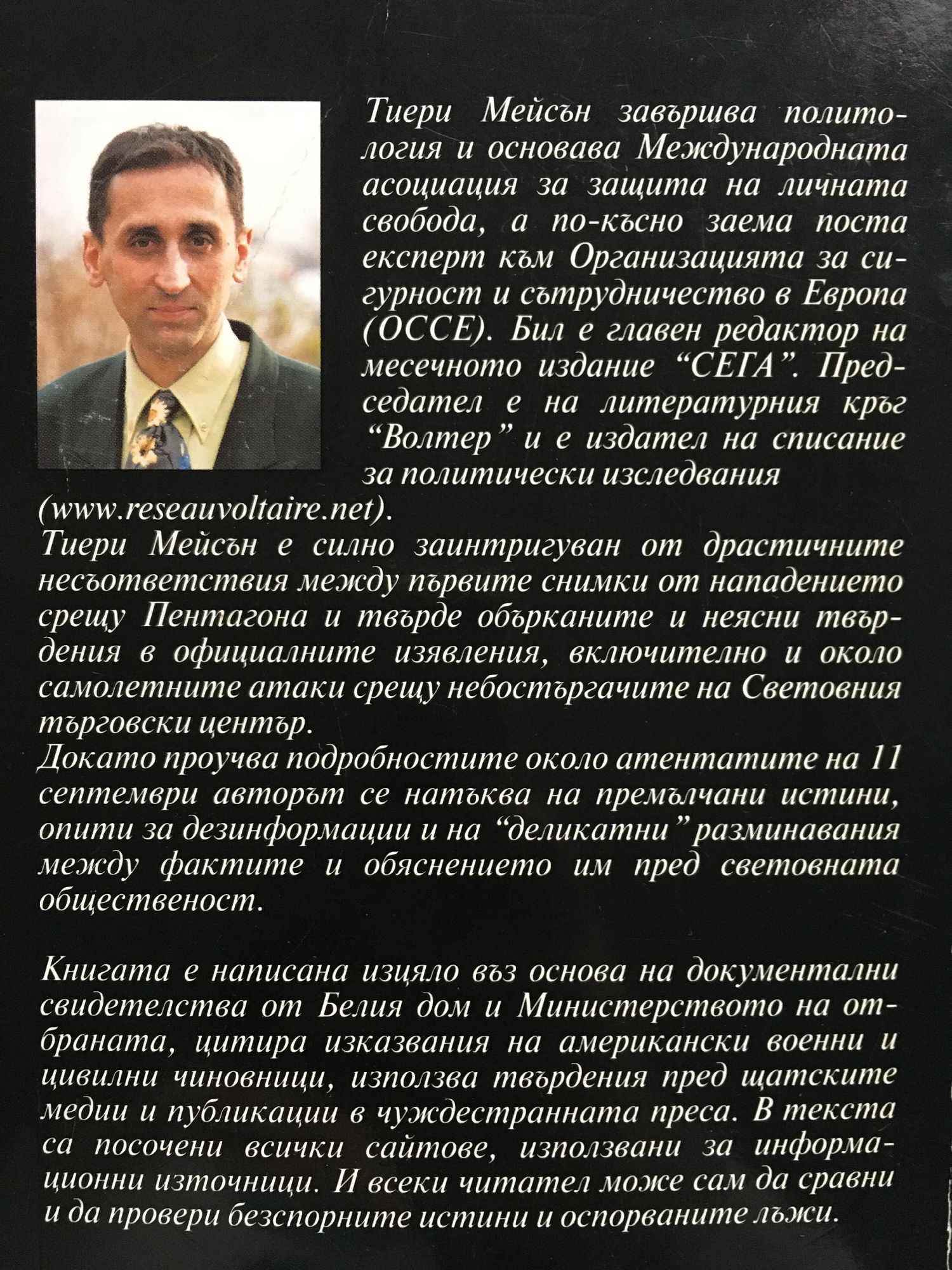 Тиери Мейсън е силно заинтригуван от драстичните несъответствия между първите снимки от нападението срещу Пентагона и твърде обърканите и неясни твърдения в официалните изявления, включително и около самолетните атаки срещу небостъргачите на Световния търговски център. Докато проучва подробностите около атентатите на 11 септември авторът се натъква на премълчани истини, опити за дезинформации и на "деликатни" разминавания между фактите и обяснението им пред световната общественост. Книгата е написана изцяло въз основа на документални свидетелства от Белия дом и Министерството на отбраната, цитира изказвания на американски военни и цивилни чиновници, използва твърдения пред щатските медии и публикации в чуждестранната преса. В текста са посочени всички сайтове, използвани за информационни източници. И всеки читател може сам да сравни и да провери безспорните истини и оспорваните лъжи.