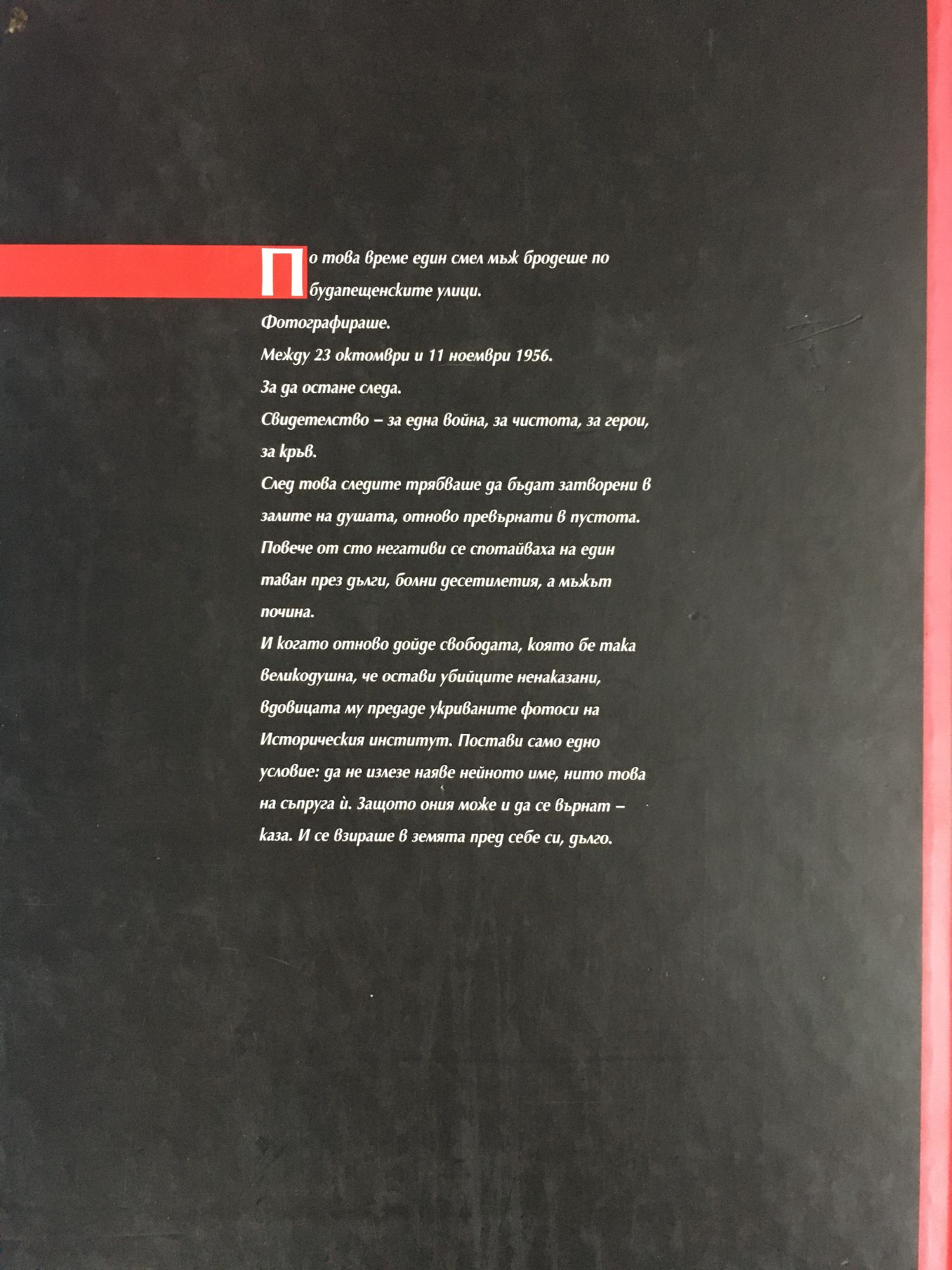 По това време един смел мъж бродеше по будапещенските улици. Фотографираше. Между 23 октомври и 11 ноември 1956. За да остане следа. Свидетелство - за една война, за чистотата, за герои, за кръв. След това следите трябваше да бъдат затворени в залите на душата, отново превърнати в пустота. Повече от сто негативи се спотайваха на един таван през, болни десетилетия, а мъжът почина. И когато отново дойде свободата, която бе така великодушна, че остави убийците ненаказани, вдовицата му предаде укриваните фотоси на Историческия институт. Постави само едно условие: да не излезе наяве нейното име, нито това на съпруга й. Защото ония може и да се върнат - каза. И се взираше в земята пред себе си, дълго.
