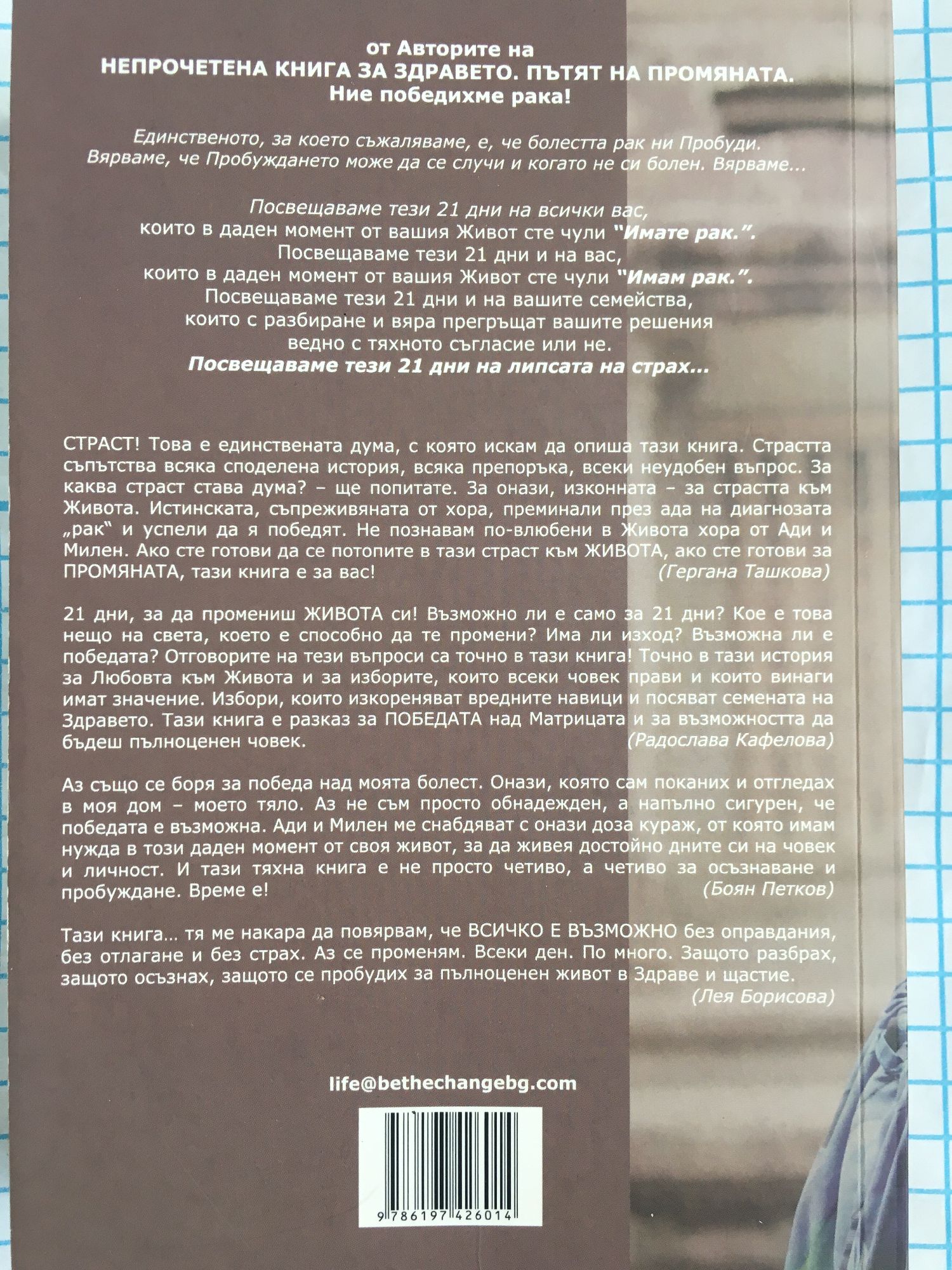 "Единственото, за което съжаляваме, е, че болестта рак ни пробуди. Вярваме, че пробуждането може да се случи и когато не си болен. Вярваме. Посвещаваме тези 21 дни на всички вас, които в даден момент от вашия живот сте чули "Имате рак". Посвещаваме тези 21 дни и на вас, които в даден момент от вашия живот живот сте чули "Имам рак". Посвещаваме тези 21 дни и на вашите семейства, които с разбиране и вяра прегръщат вашите решения в едно с тяхното съгласие или не. посвещаваме тези 21 дни на липсата на страх." От авторите "Страст! Това е единствената дума, с която искам да опиша тази книга. Страстта съпътства всяка споделена история, всяка препоръка, всеки неудобен въпрос. За каква страст става дума? - ще попитате. За онази, изконната - за страстта към Живота. Истинската, съпреживяванията от хора, преминали през ада на диагнозата "рак" и успели да я победят. Не познавам по-влюбени към живота хора от Ади и Милен. Ако сте готови да се потопите в тази страст към живота, ако сте готови за промяната, тази книга е за вас! Гергана Ташкова "21 дни, за да промениш живота си! Възможно ли е само за 21 дни? Кое е това нещо на света, което е способно да те промени? Има ли изход? Възможна ли е победата? Отговорите на тези въпроси са точно в тази книга! Точно в тази история за Любовта към Живота и за изборите, които всеки човек прави и които винаги имат значение. Избори, които изкореняват вредните навици и посяват семената на Здравето. Тази книга е разказ за победата над Матрицата и за възможността да бъдеш пълноценен човек." Радослава Кафелова "Аз също се боря за победа над моята болест. Онази, която сам поканих и отгледах в моя дом - моето тяло. Аз не съм просто обнадежден, а напълно сигурен, че победата е възможна. Ади и Милен ме снабдяват с онази доза кураж, от която имам нужда в този даден момент от своя живот, за да живея достойно дните си на човек и личност. И тази тяхна книга е не просто четиво, а четиво за осъзнаване и пробуждане. Време е!" Боян Петков "Тази книга... тя ме накара да повярвам, че всичко е възможно без оправдания, без отлагане и без страх. Аз се променям. Всеки ден. По много. Защото разбрах, защото осъзнах, защото се пробудих за пълноценен живот в Здраве и щастие." Лея Борисова