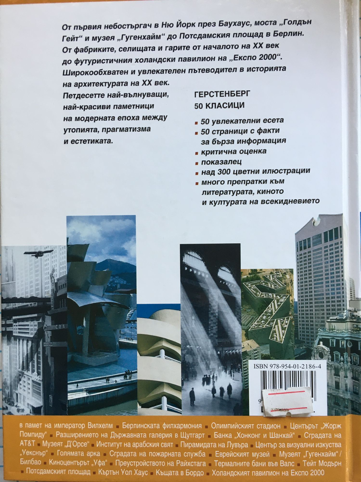 От първия небостъргач в Ню Йорк през Баухаус, моста „Голдън Гейт" и музея „Гугенхайм" до Потсдамския площад в Берлин. От фабриките, селищата и гарите от началото на XX век до футуристичния холандски павилион на „Експо 2000". Широкообхватен и увлекателен пътеводител в историята на архитектурата на XX век. Петдесетте най-вълнуващи, най-красиви паметници на модерната епоха между утопията, прагматизма и естетиката.