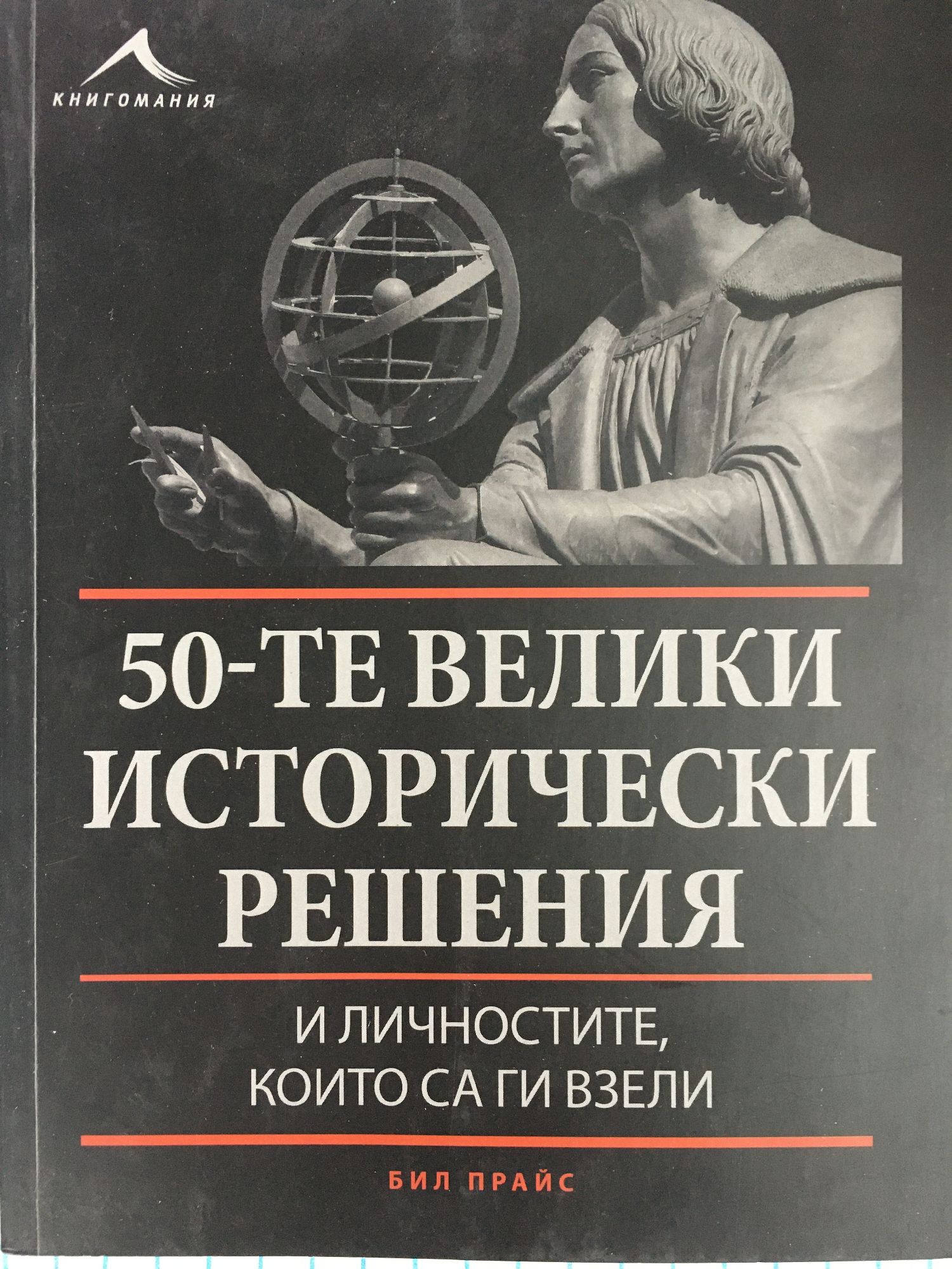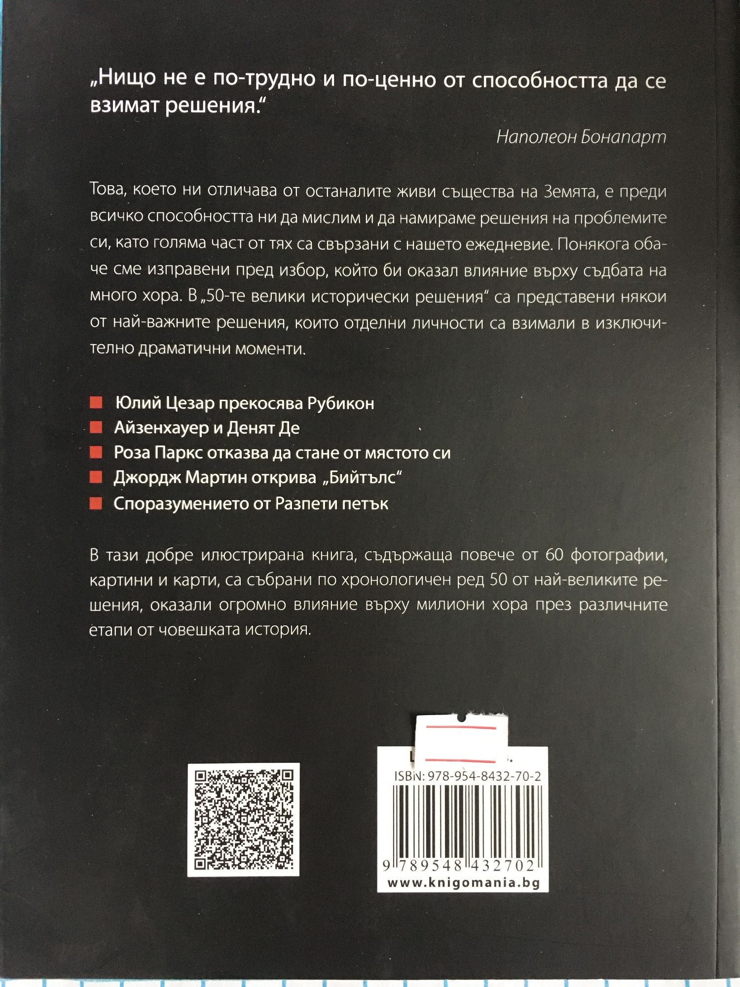 Нищо не е по-трудно и по-ценно от способността да се взимат решения. Наполеон Бонапарт Това, което ни отличава от останалите живи същества на Земята, е преди всичко способността ни да мислим и да намираме решения на проблемите си, като голяма част от тях са свързани с нашето ежедневие. Понякога обаче сме изправени пред избор, който би оказал влияние върху съдбата на много хора. В „50-те велики исторически решения“ са представени някои от най-важните решения, които отделни личности са взимали в изключително драматични моменти. Юлий Цезар прекосява Рубикон Айзенхауер и Денят Де Роза Паркс отказва да стане от мястото си Джордж Мартин открива „Бийтълс“ Споразумението от Разпети петък В тази добре илюстрирана книга, съдържаща повече от 60 фотографии, картини и карти, са събрани по хронологичен ред 50 от най-великите решения, оказали огромно влияние върху милиони хора през различните етапи от човешката история.