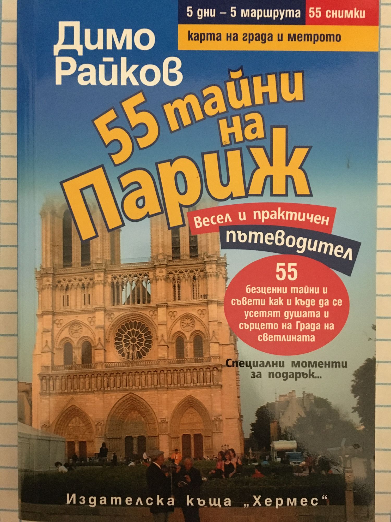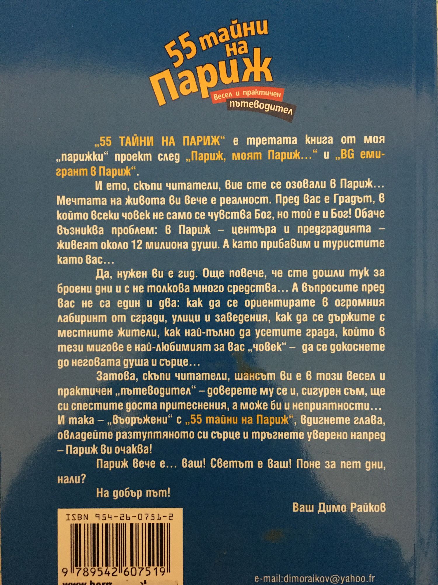 "55 ТАЙНИ НА ПАРИЖ" е третата книга от моя "парижки" проект след "Париж, моят Париж…" и "BG eмигрант в Париж". И ето, скъпи читатели, вие сте се озовали в Париж… Мечтата на живота ви вече е реалност. Пред вас е Градът, в който всеки човек не само се чувства Бог, но той е и Бог! Обаче възниква проблем – в Париж, центъра и предградията – живеят около 12 милиона души. А като прибавим и туристите като вас… Да, нужен ви е гид. Още повече, че сте дошли тук за броени дни и с не толкова много средства… А въпросите пред вас не са един и два – как да се ориентирате в огромния лабиринт от сгради, улици и заведения, как да се държите с местните жители, как най-пълно да усетите града, който в тези мигове е най-любимият за вас "човек"– да се докоснете до неговата душа и сърце… Затова, скъпи читатели, шансът ви е в този весел и практичен "пътеводител" – доверете му се и, сигурен съм, ще си спестите доста притеснения, а може би и неприятности… И така – "въоръжени" с "55 тайни на Париж", вдигнете глава, овладейте разтуптяното си сърце и тръгнете уверено напред – Париж ви очаква! Париж вече е… ваш! Светът е ваш! Поне за пет дни, нали? На добър път! Ваш Димо Райков
