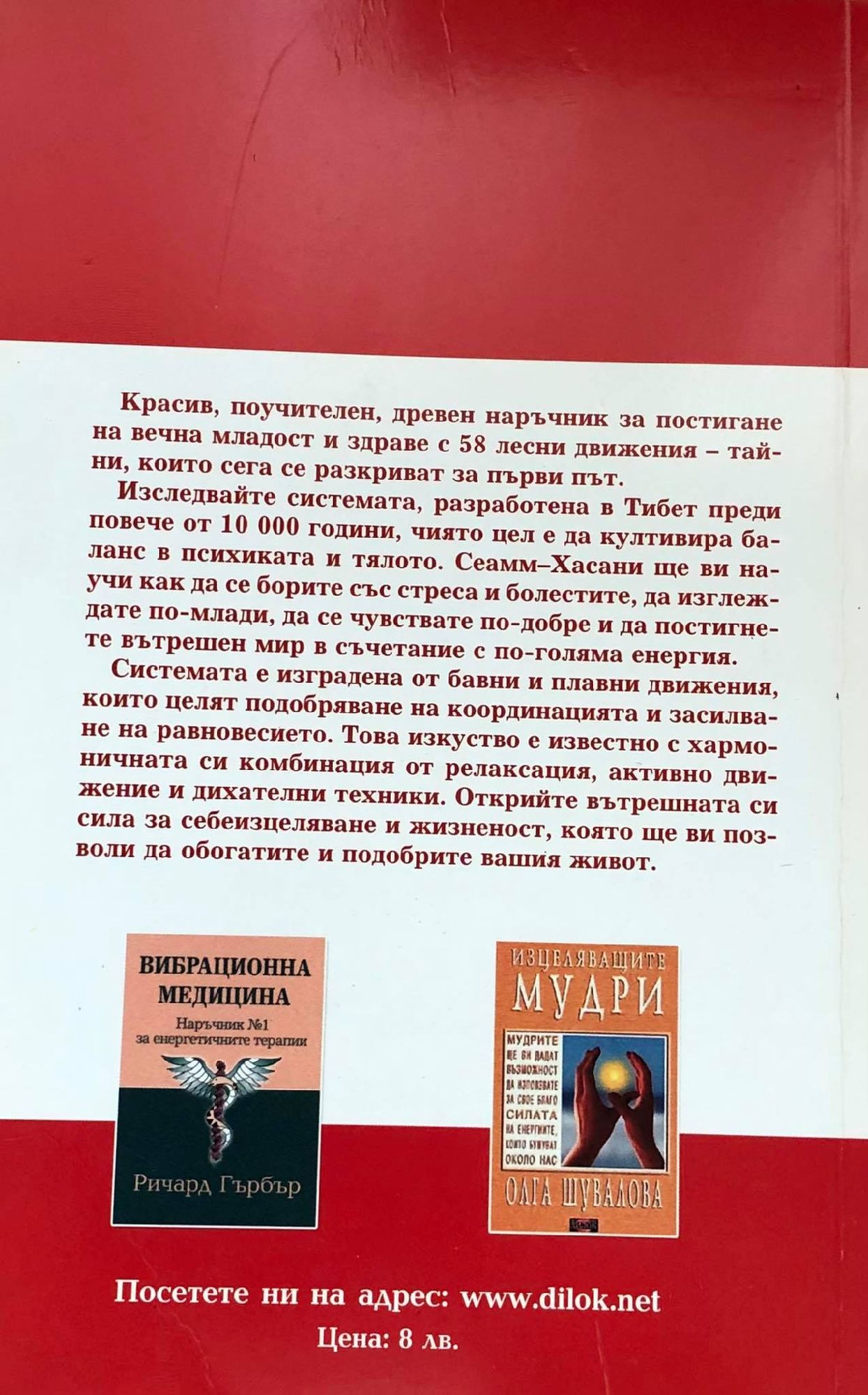 Красив, поучителен, древен наръчник за постигане на вечна младост и здраве с 58 лесни движения - тайни, които сега се разкриват за първи път. Изследвайте системата, разработена в Тибет преди повече от 10 000 години, чиято цел е да култивира баланс в психиката и тялото. Сеамм-Хасани ще ви научи как да се борите със стреса и болестите, да изглеждате по-млади, да се чувствате по-добре и да постигнете вътрешен мир в съчетание с по-голяма енергия. Системата е изградена от бавни и плавни движения, които целят подобряване на координацията и засилване на равновесието. Това изкуство е известно с хармоничната си комбинация от релаксация, активно движение и дихателни техники. Открийте вътрешната си сила за себеизцеляване и жизненост, която ще ви позволи да обогатите и подобрите вашия живот. Поздравления за вашия избор! И нека космическият вятър винаги да духа във вашата посока! За автора Асанаро е посветил повече от двадесет години на изучаването и преподаването на Алтернативни изкуства и Философия, възникнали в будистки Тибет, предавани като тридесет и три различни науки за релаксация, защита, медитация и философия. Асанаро е преподавал по целия свят, предлагайки курсове и основавайки школи в Южна Америка, Европа и САЩ. От инструментално значение е за основаването и създаването на различни центрове и асоциации за алтернативни изкуства и медицина, включително "Самсара" - чилийска организация с идеална цел, посветена на алтернативната медицина и самоизцеляването. Той е автор на Bamso: The Art of Dreams ("Бамсо: изкуството на сънищата") - наръчник по медитация и астрално насочване. Днес живее в Чили.