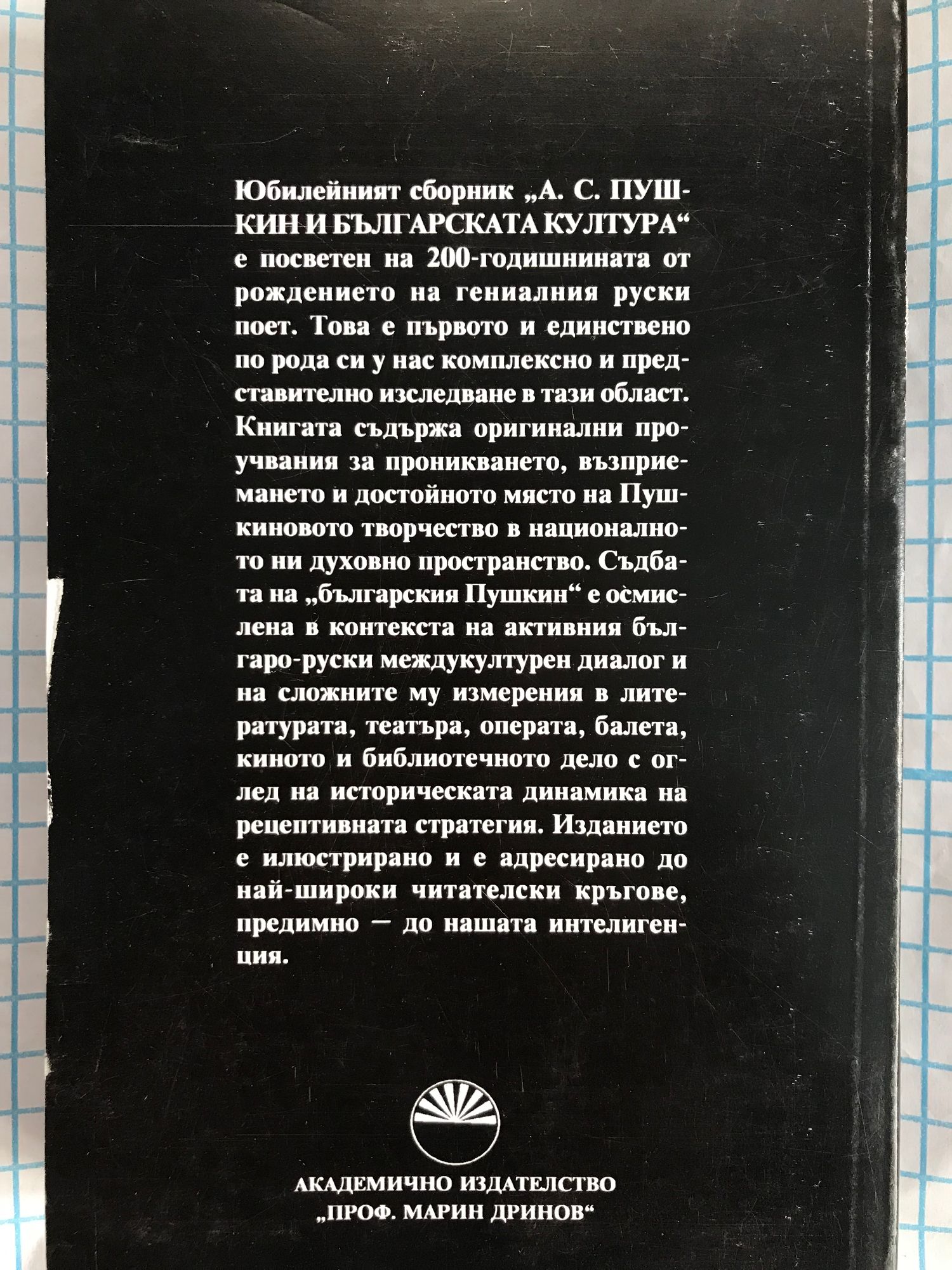 Юбилейният сборник " А. С. Пушкин и българската култура" е посветен на 200-годишнината от рождението на гениалния руски поет. Това е първото и единствено по рода си у нас комплексно и представително изследване в тази област. Книгата съдържа оригинални проучвания за проникването, възприемането и достойното място на Пушкиновото творчество в националното ни духовно пространство. Съдбата на "българския Пушкин" е осмислена в контекста на активния българо-руски междукултурен диалог и на сложните му измерения в литературата, театъра, операта, балета, киното и библиотечното дело с оглед на историческата динамика на рецептивната стратегия.