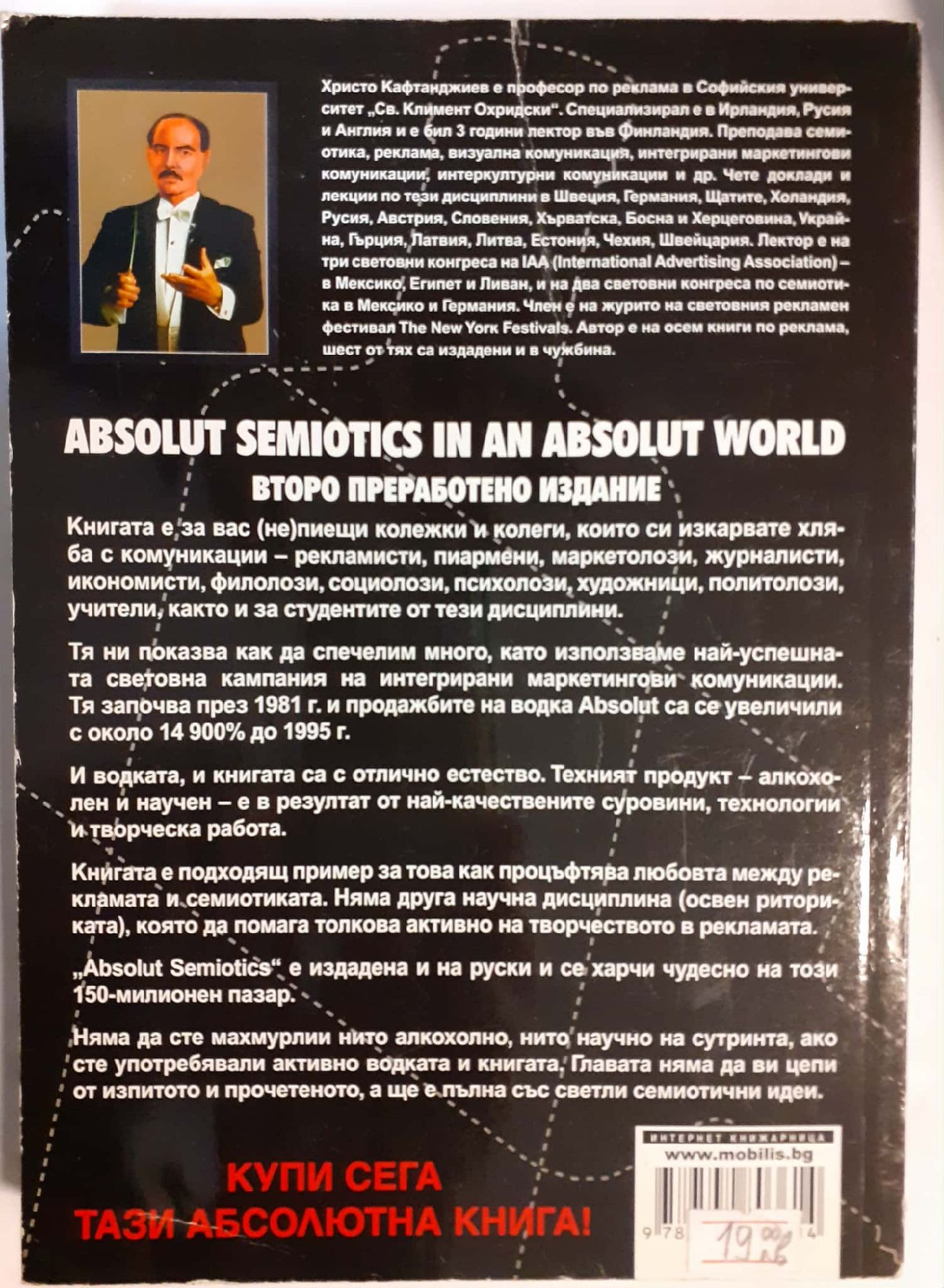 Книгата е за вас (не)пиещи и колежки и колеги, които си изкарвате хляба с комуникации - рекламисти, пиармени, маркетолози, журналисти, икономисти, филолози, социолози, психолози, художници, политолози, учители, както и за студентите от тези дисциплини. Тя ни показва Как да спечелим много, като използваме най-успешната световна кампания на интегрирани маркетингови комуникации. Тя започва през 1981 година и продажбите на водка абсолют са се увеличили с около 14900% до 1995 година. И водката и книгата са с отлично естество. Техният продукт - алкохолен и научен - е в резултат на най-качествените суровини, технологии и творческа работа. Книгата е подходящ пример за това как процъфтява любовта между рекламата и семиотиката. Няма друга научна дисциплина (освен риториката), която да помага толкова активно на творчеството и рекламата.