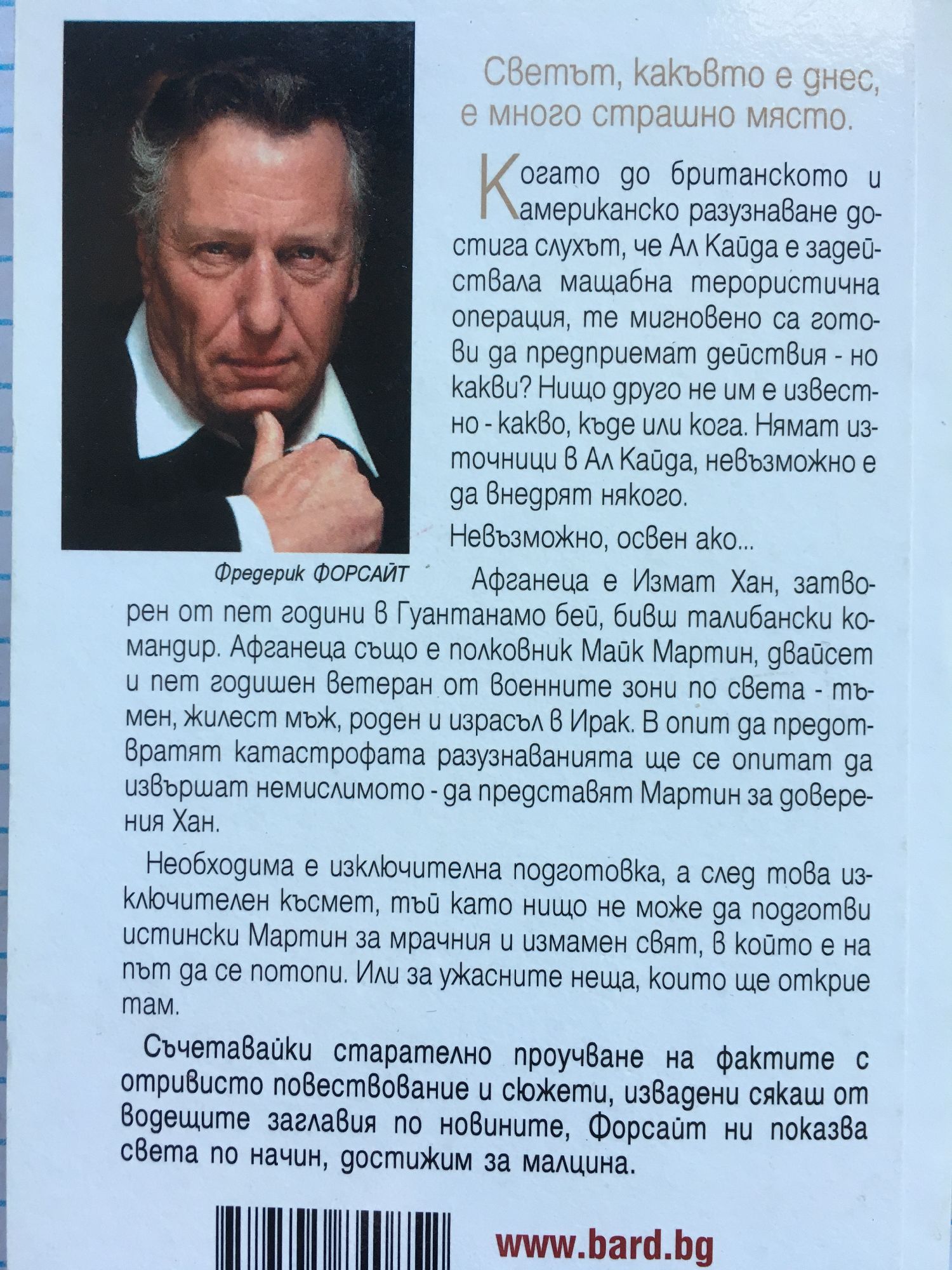 Драматична и вледеняващо пророческа книга от върховния майстор на международния трилър! Светът, какъвто е днес, е много страшно място! Когато до британското и американското разузнаване достига слухът, че Ал Кайда е задействала мащабна терористична операция, те мигновено са готови да предприемат действия - но какви? Нищо друго не им е известно - какво, къде или кога. Нямат източници в Ал Кайда, невъзможно е да внедрят някого. Невъзможно, освен ако... Афганеца е Измат Хан, затворен от пет години в Гуантанамо , бивш талибански командир. Афганеца също е полковник Майк Мартин, ветеран от военните зони по света - мургав жилест мъж, роден и израсъл в Ирак. В опит да предотвратят катастрофата разузнаванията ще се опитат да извършат немислимото - да представят Мартин за доверения Хан. Необходима е изключителна подготовка, а след това изключителен късмет, тъй като нищо не може да подготви истински Мартин за мрачния и измамен свят, в който е на път да се потопи. Или за ужасните неща, кито ще открие там. Съчетавайки старателно проучване на фактите с отривисто повествование и сюжети, извадени сякаш от водещите заглавия по новините, Форсайт ни показва света по начин, достижим за малцина.