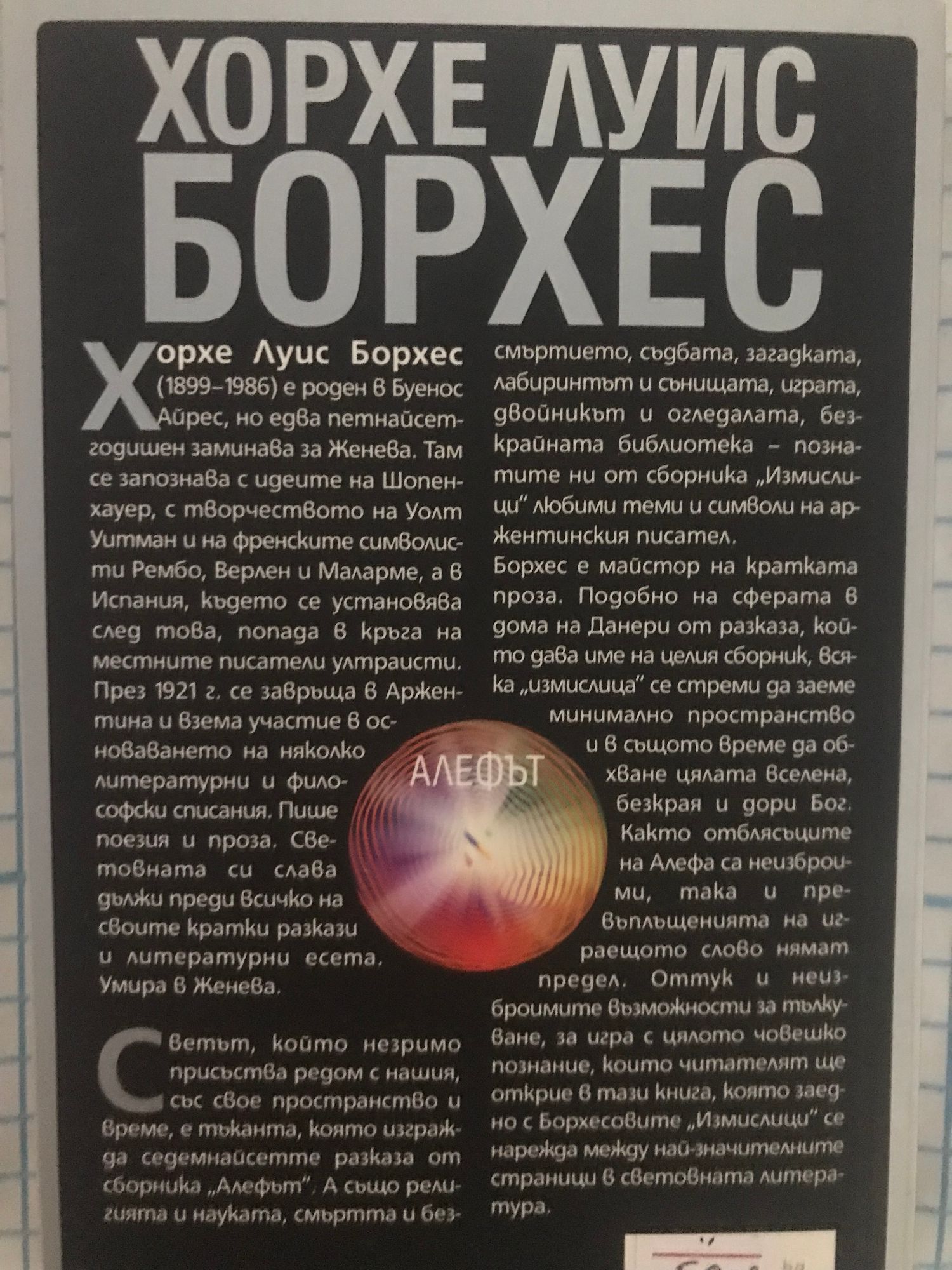 Светът, който незримо присъства редом с нашия, със свое пространство и време, е тъканта, която изгражда седемнайсетте разказа от сборника „Алефът“. А също религията и науката, смъртта и безсмъртието, съдбата, загадката, лабиринтът и сънищата, играта, двойникът и огледалата, безкрайната библиотека – познатите ни от сборника „Измислици“ любими теми и символи на аржентинския писател. Борхес е майстор на кратката проза. Подобно на сферата в дома на Данери от разказа, който дава име на целия сборник, всяка „измислица“ се стреми да заеме минимално пространство и в същото време да обхване цялата вселена, безкрая и дори Бог. Както отблясъците на Алефа са неизброими, така и превъплъщенията на играещото слово нямат предел. Оттук и неизброимите възможности за тълкуване, за игра с цялото човешко познание, които читателят ще открие в тази книга, която заедно с Борхесовите „Измислици“ се нарежда между най-значителните страници в световната литература.
