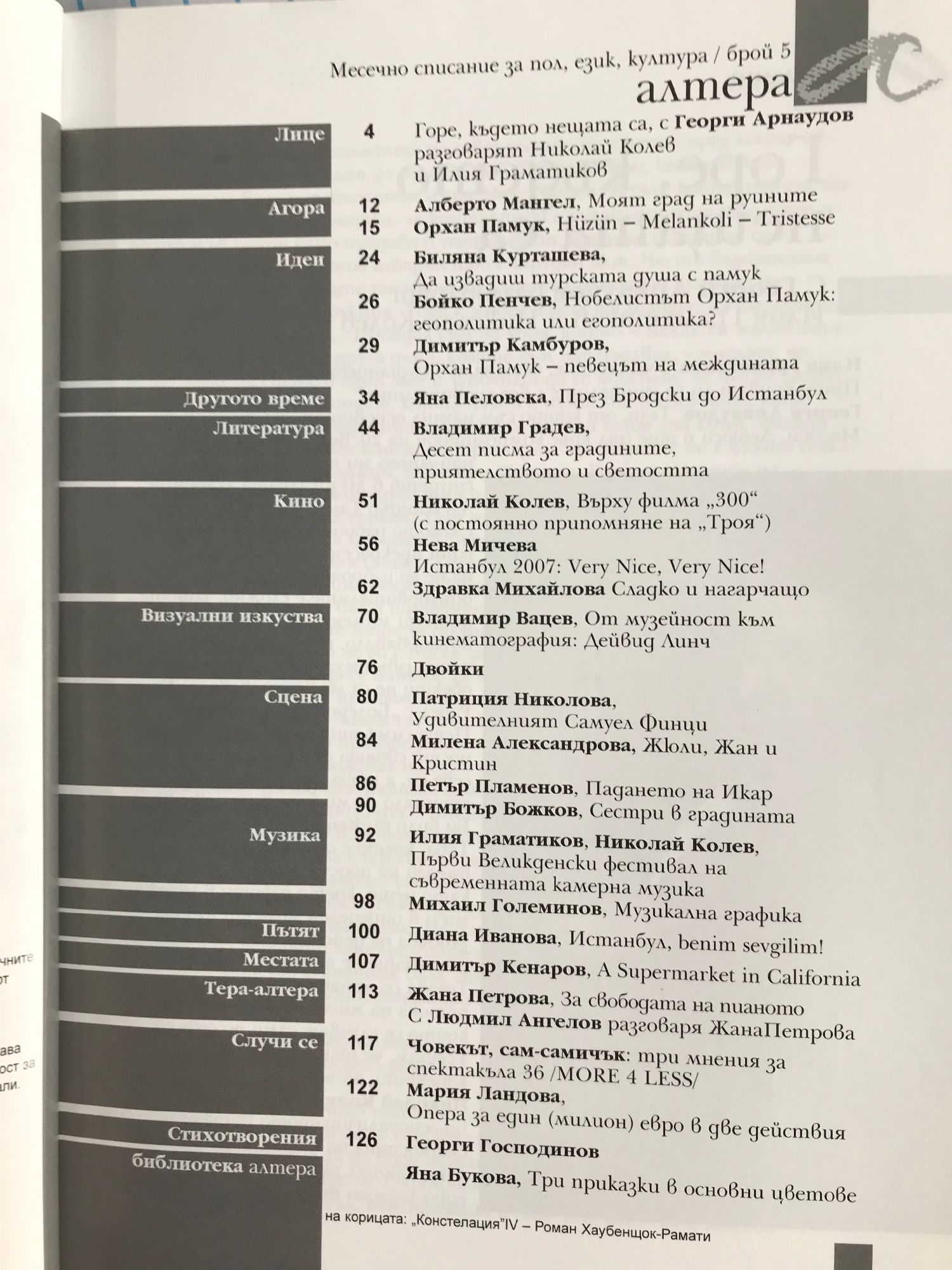 Георги Арнаудов - Горе, където нещата са. Памук, Бродски и Истанбул. От музейност към кинематография: Дейвид Линч. A Supermarket in California.Човекът, сам-самичък. Георги Господинов. Яна Букова.