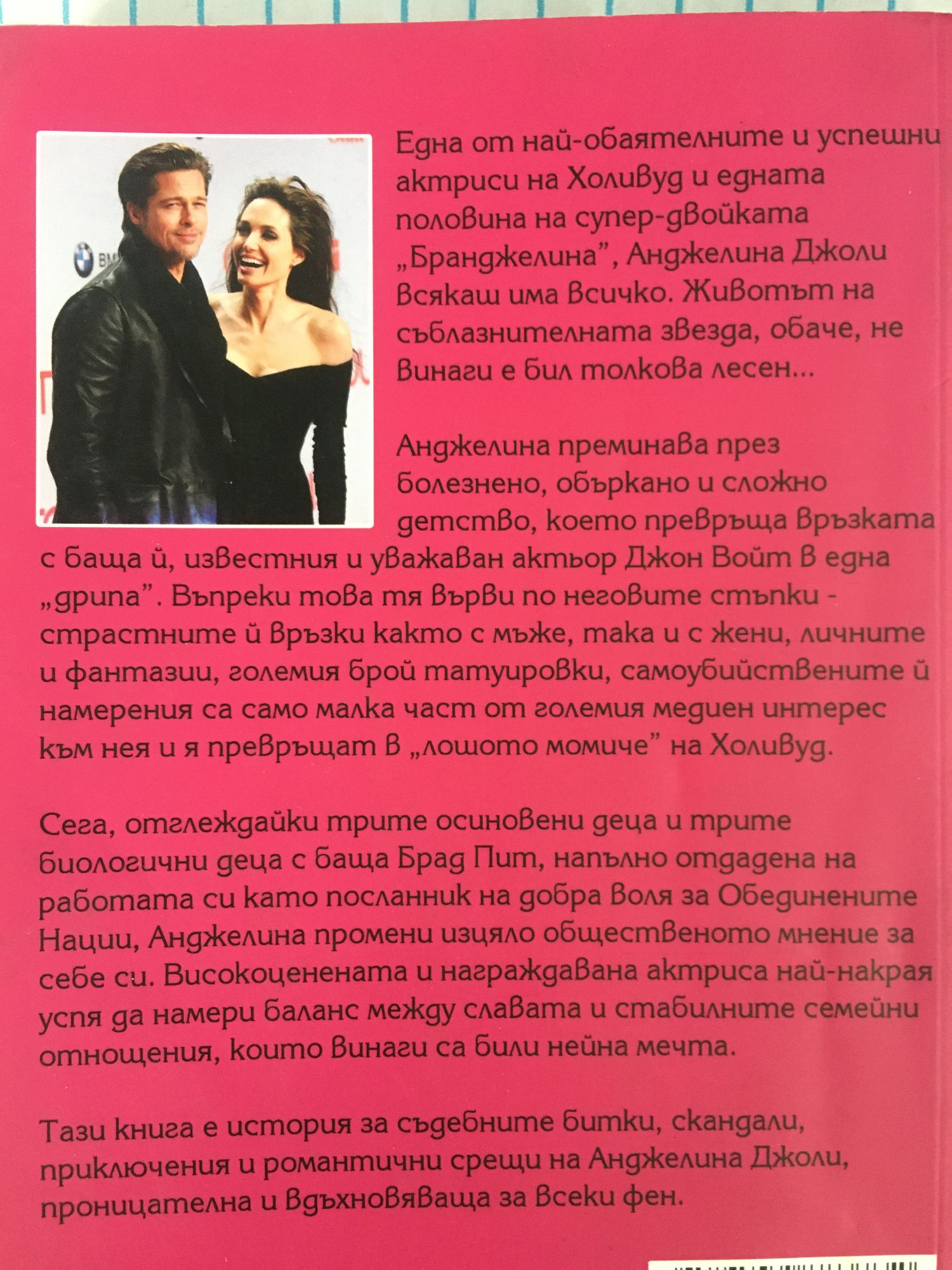Една от най-обаятелните и успешни актриси на Холивуд и едната половина на супер-двойката "Бранджелина", Анджелина Джоли сякаш има всичко. Животът на съблазнителната звезда, обаче не винаги е бил толкова лесен. Анджелина преминава през болезнено, объркано и сложно детство, което превръща връзката с баща й, известния и уважаван актьор Джон Войт в една "дрипа". Въпреки това тя върви по неговите стъпки - страстните й връзки както с мъже ,така и с жени, личните й фантазии, големия брой татуировки, самоубийствените й намерения са само малка част от големия медиен интерес към нея и я превръщат в "лошото момиче" на Холивуд. Сега, отглеждайки трите осиновени деца и трите биологични деца с баща Брад Пит, напълно отдадена на работата си като посланик на добра воля на Обединените Нации, Анджелина промени изцяло общественото мнение за себе си. Високо ценената и награждавана актриса най-накрая успя да намери баланс между славата и стабилните семейни отношения, които винаги са били нейна мечта. Тази книга е история за съдебните битки, скандали, приключения и романтични срещи на Анджелина Джоли, проницателна и вдъхновяваща за всеки ден.