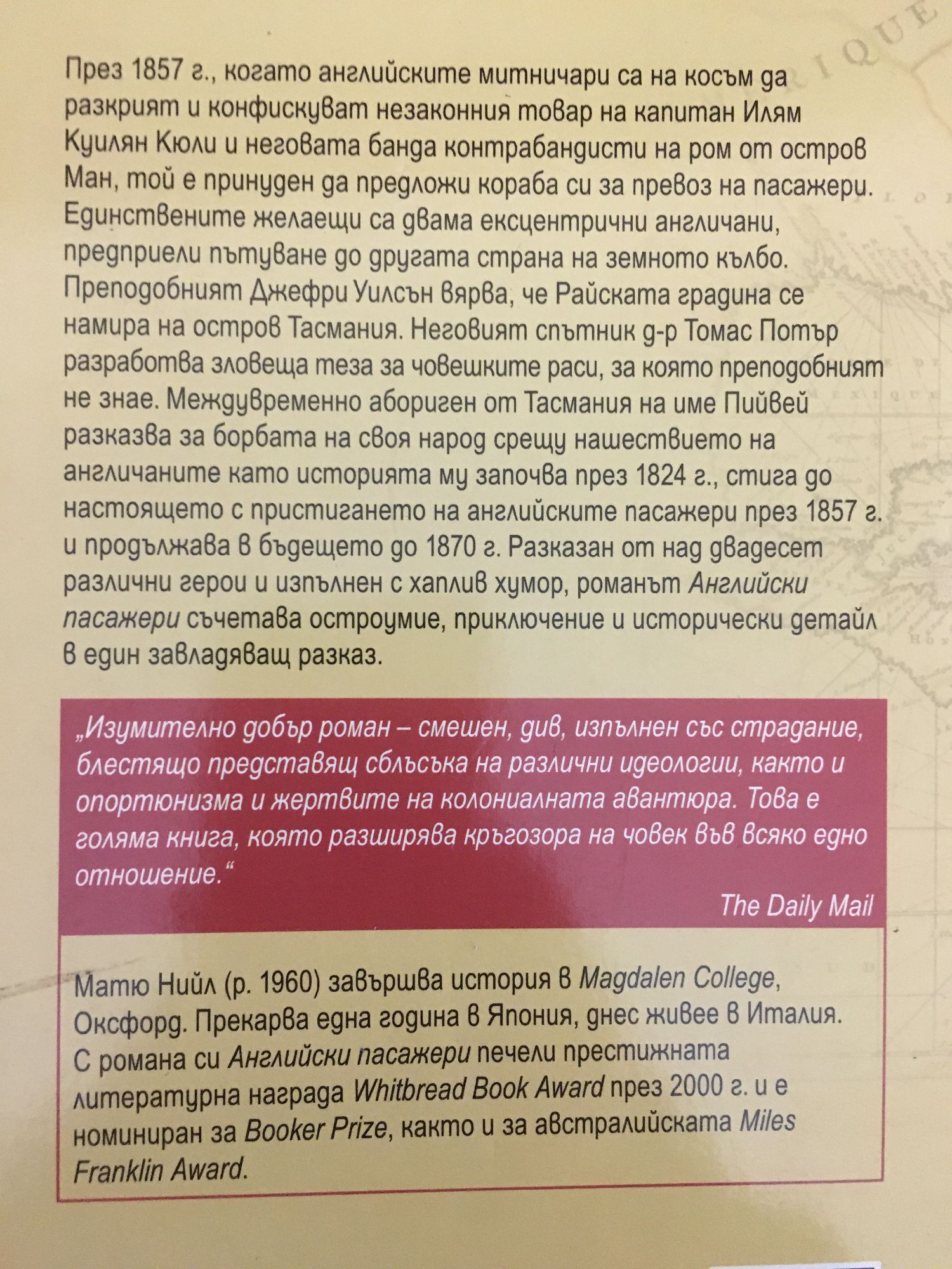През 1857 г., когато английските митничари са на косъм да разкрият и конфискуват незаконния товар на капитан Илям Куилян Кюли и неговата банда контрабандисти на ром от остров Ман, той е принуден да предложи кораба си за превоз на пасажери. Единствените желаещи са двама ексцентрични англичани, предприели пътуване до другата страна на земното кълбо. Преподобният Джефри Уилсън вярва, че Райската градина се намира на остров Тасмания. Неговият спътник д-р Томас Потър разработва зловеща теза за човешките раси, за която преподобният не знае. Междувременно абориген от Тасмания на име Пийвей разказва за борбата на своя народ срещу нашествието на англичаните, като историята му започва през 1824 г., стига до настоящето с пристигането на английските пасажери през 1857 г. и продължава в бъдещето до 1870 г. Разказан от над двадесет различни герои и изпълнен с хаплив хумор, романът "Английски пасажери" съчетава остроумие, приключение и исторически детайл в един завладяващ разказ.