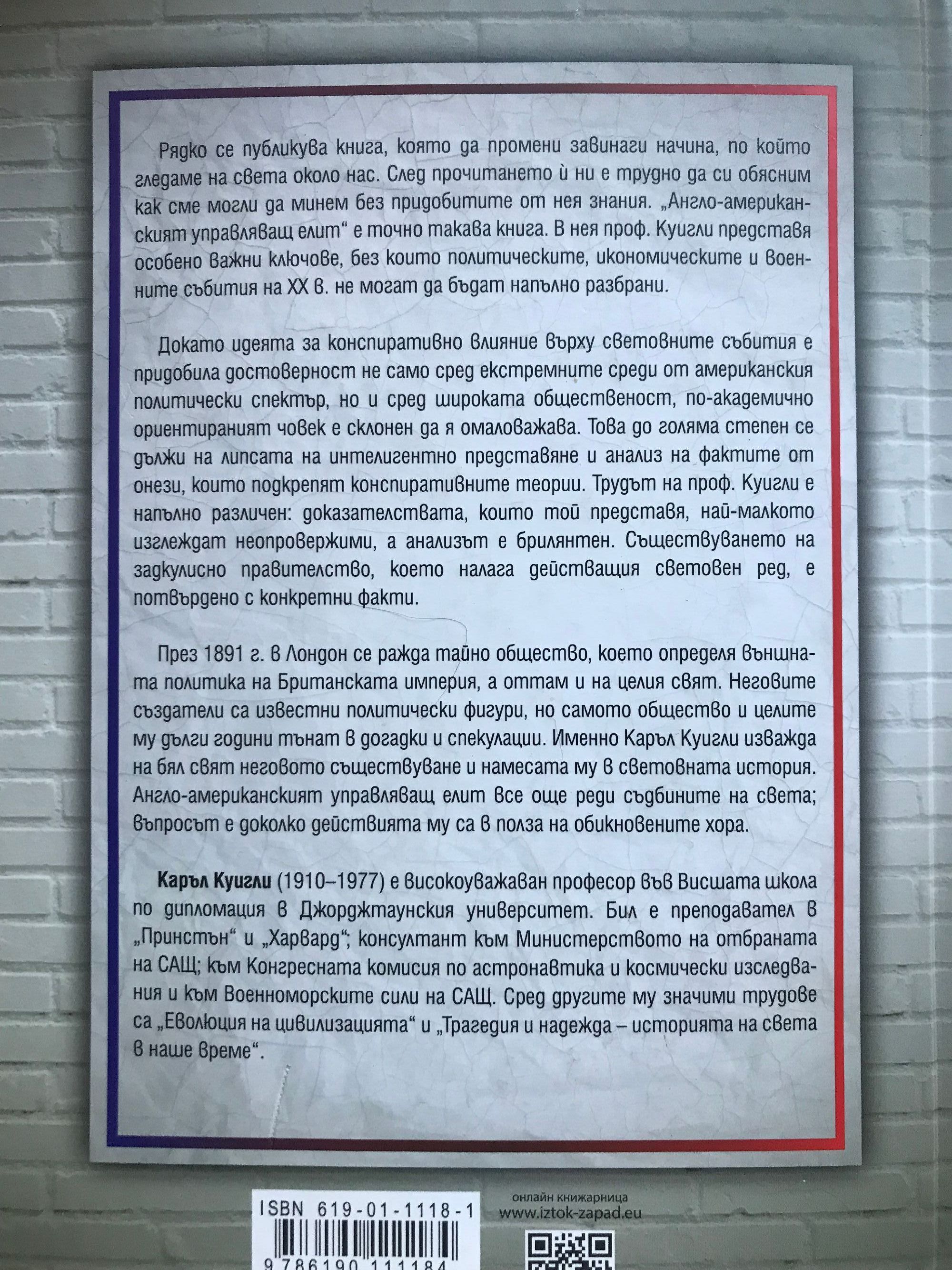 Рядко се публикува книга, която да промени завинаги начина, по който гледаме на света около нас. След прочитането й ни е трудно да си обясним как сме могли да минем без придобитите от нея знания. „Англо-американският управляващ елит“ е точно такава книга. В нея проф. Куигли представя особено важни ключове, без които политическите, икономическите и военните събития на XX в. не могат да бъдат напълно разбрани. Докато идеята за конспиративно влияние върху световните събития е придобила достоверност не само сред екстремните среди от американския политически спектър, но и сред широката общественост, по-академично ориентираният човек е склонен да я омаловажава. Това до голяма степен се дължи на липсата на интелигентно представяне и анализ на фактите от онези, които подкрепят конспиративните теории. Трудът на проф. Куигли е напълно различен: доказателствата, които той представя, най-малкото изглеждат неопровержими, а анализът е брилянтен. Съществуването на задкулисно правителство, което налага действащия световен ред, е потвърдено с конкретни факти. През 1891 г. в Лондон се ражда тайно общество, което определя външната политика на Британската империя, а оттам и на целия свят. Неговите създатели са известни политически фигури, но самото общество и целите му дълги години тънат в догадки и спекулации. Именно Каръл Куигли изважда на бял свят неговото съществуване и намесата му в световната история. Англо-американският управляващ елит все още реди съдбините на света; въпросът е доколко действията му са в полза на обикновените хора.