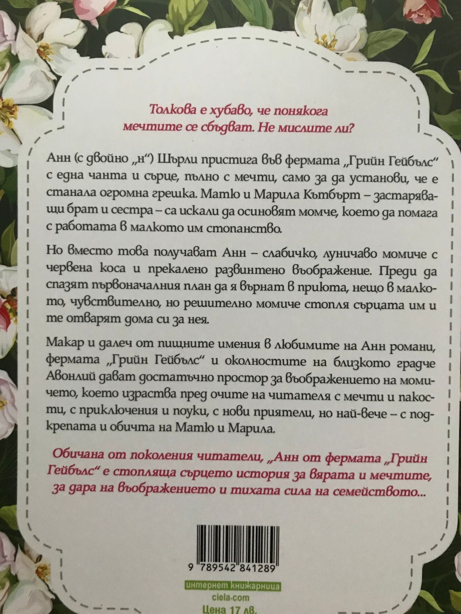 Толкова е хубаво, че понякога мечтите се сбъдват. Не мислите ли? Анн (с двойно „н“) Шърли пристига във фермата „Грийн Гейбълс“ с една чанта и сърце, пълно с мечти, само за да установи, че е станала огромна грешка. Матю и Марила Кътбърт – застаряващи брат и сестра – са искали да осиновят момче, което да помага с работата в малкото им стопанство. Но вместо това получават Анн – слабичко, луничаво момиче с червена коса и прекалено развинтено въображение. Преди да спазят първоначалния план да я върнат в приюта, нещо в малкото, чувствително, но решително момиче стопля сърцата им и те отварят дома си за нея. Макар и далеч от пищните имения в любимите на Анн романи, фермата „Грийн Гейбълс“ и околностите на близкото градче Авонлий дават достатъчно простор за въображението на момичето, което израства пред очите на читателя с мечти и пакости, с приключения и поуки, с нови приятели, но най-вече – с подкрепата и обичта на Матю и Марила. Обичана от поколения читатели, „Анн от фермата „Грийн Гейбълс“ е стопляща сърцето история за вярата и мечтите, за дара на въображението и тихата сила на семейството…