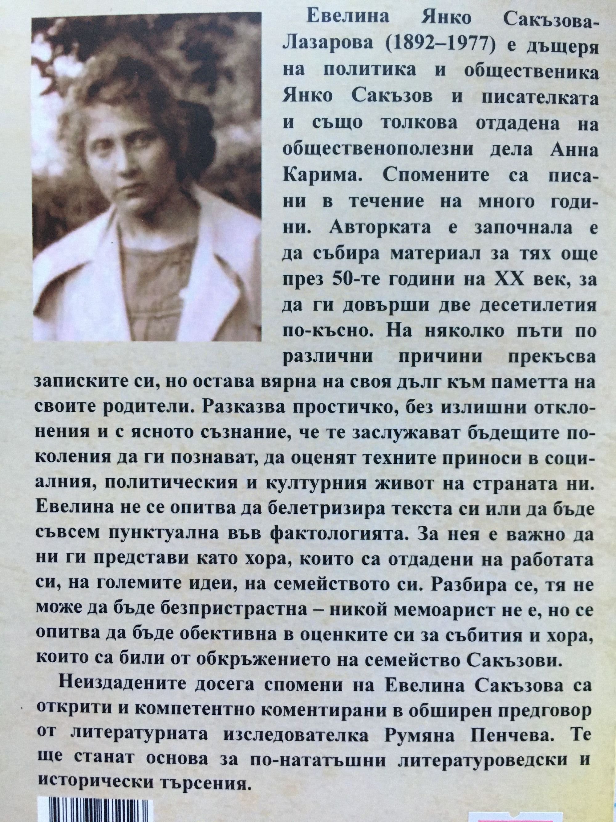 Евелина Янко Сакъзова-Лазарова е дъщеря на политика и общественика Янко Сакъзов и писателката, и също толкова отдадена на общественополезни дела Анна Карима. Спомените са писани в течение на много години. Авторката е започнала да събира материал за тях още през 50-те години на XX век, за да ги довърши две десетилетия по-късно. На няколко пъти по различни причини прекъсва записките си, но остава вярна на своя дълг към паметта на своите родители. Разказва простичко, без излишни отклонения и с ясното съзнание, че те заслужават бъдещите поколения да ги познават, да оценят техните приноси в социалния, политическия и културния живот на страната ни. Евелина не се опитва да белетризира текста си или да бъде съвсем пунктуална във фактологията. За нея е важно да ни ги представи като хора, които са отдадени на работата си, на големите идеи, на семейството си. Разбира се, тя не може да бъде безпристрастна – никой мемоарист не е, но се опитва да бъде обективна в оценките си за събития и хора, които са били от обкръжението на семейство Сакъзови. Неиздадените досега спомени на Евелина Сакьзова са открити и компетентно коментирани в обширен предговор от литературната изследователка Румяна Пенчева. Те ще станат основа за по-нататъшни литературоведски и исторически търсения.