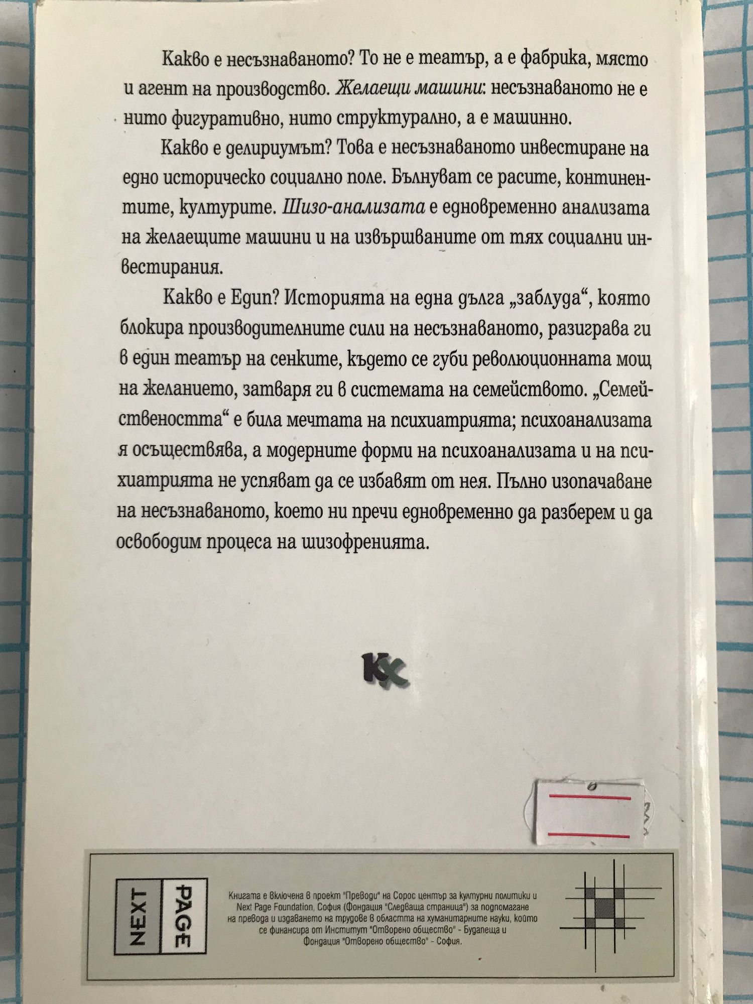Какво е несъзнаваното? То не е театър, а е фабрика, място и агент на производство. Желаещи машини: несъзнаваното не е нито фигуративно, нито структурално, а е машинно. Какво е делириумът? Това е несъзнаваното инвестиране на едно историческо социално поле. Бълнуват се расите, континентите, културите. Шизо-анализата е едновременно анализата на желаещите машини и на извършваните от тях социални инвестирания. Какво е Едип? Историята на една дълга “заблуда”, която блокира производителните сили на несъзнаваното, разиграва ги в един театър на сенките, където се губи революционната мощ на желанието, затваря ги в системата на семейството. “Семействеността” е била мечтата на психиатрията; психоанализата я осъществява, а модерните форми на психоанализата и на психиатрията не успяват да се избавят от нея. Пълно изопачаване на несъзнаваното, което ни пречи едновременно да разберем и да освободим процеса на шизофрения.