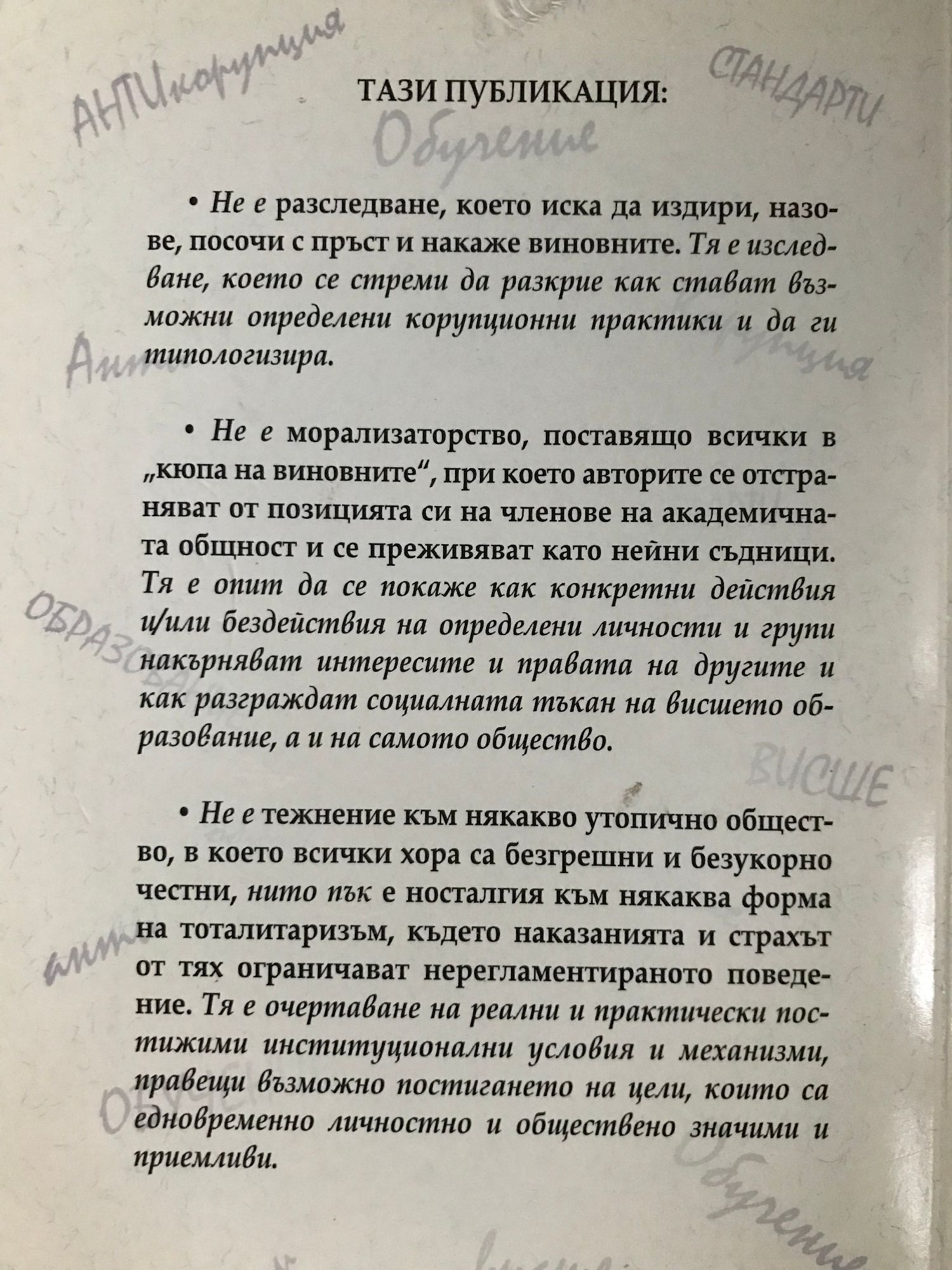 "Тази публикация: Не е разследване, което иска да издири, назове и покаже с пръст виновните. Тя е изследване, което се стреми да разкрие как стават възможни определени корупционни практики и да ги типологизира. Не е морализаторство, поставящо всички в “кюпа на виновните”, при което авторите се отстраняват от позицията си на членове на академичната общност и се преживяват като нейни съдници. Тя е опит да се покаже как конкретни действия и/или бездействия на определени личности и групи накърняват интересите и правата на другите и как разграждат социалната тъкан на висшето образование, а и на самото общество. Не е тежнение към някакъв тип утопично общество, н което всички хора са безгрешни и безукорно честни, нито пък е носталгия към някаква форма на тоталитаризъм, където наказанията и страхът от тях ограничават нерегламентираното поведение. Тя е очертаване на реални и практически постижими институционални условия и механизми, правещи възможно постигането на цели, които са едновременно личностно и обществено значими и преимливи."