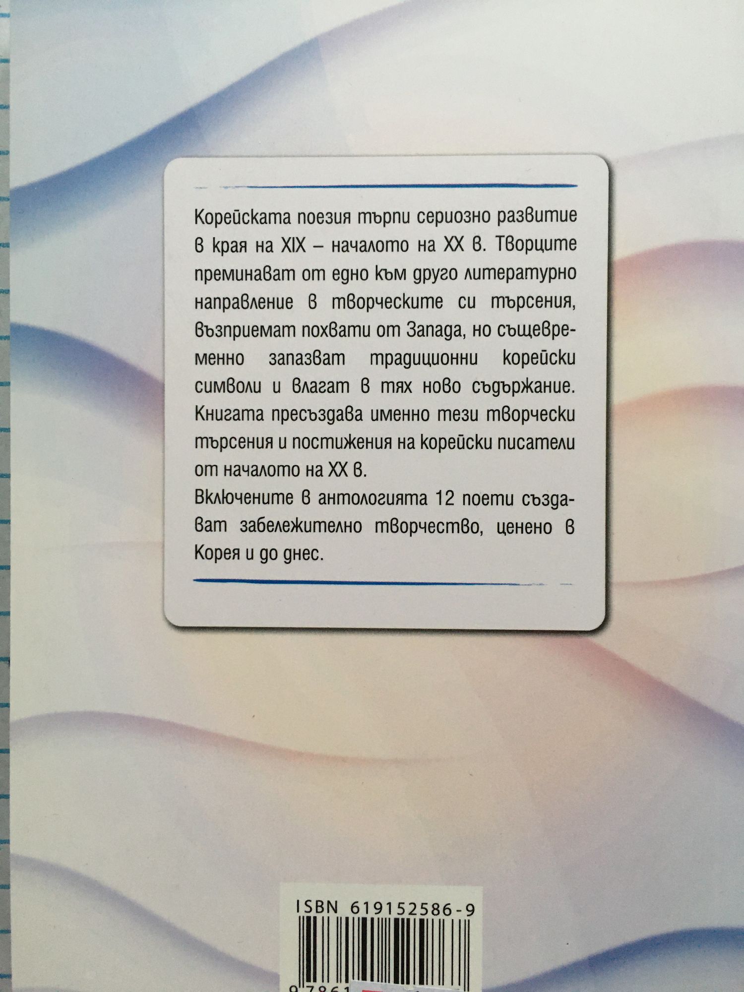 Корейската поезия търпи сериозно развитие в края на ХІХ – началото на ХХ в. Творците преминават от едно към друго литературно направление в творческите си търсения, възприемат похвати от Запада, но същевременно запазват традиционни корейски символи и влагат в тях ново съдържание. Книгата пресъздава именно тези творчески търсения и постижения на корейски писатели от началото на ХХ в. Включените в антологията 12 поети създават забележително творчество, ценено в Корея и до днес.