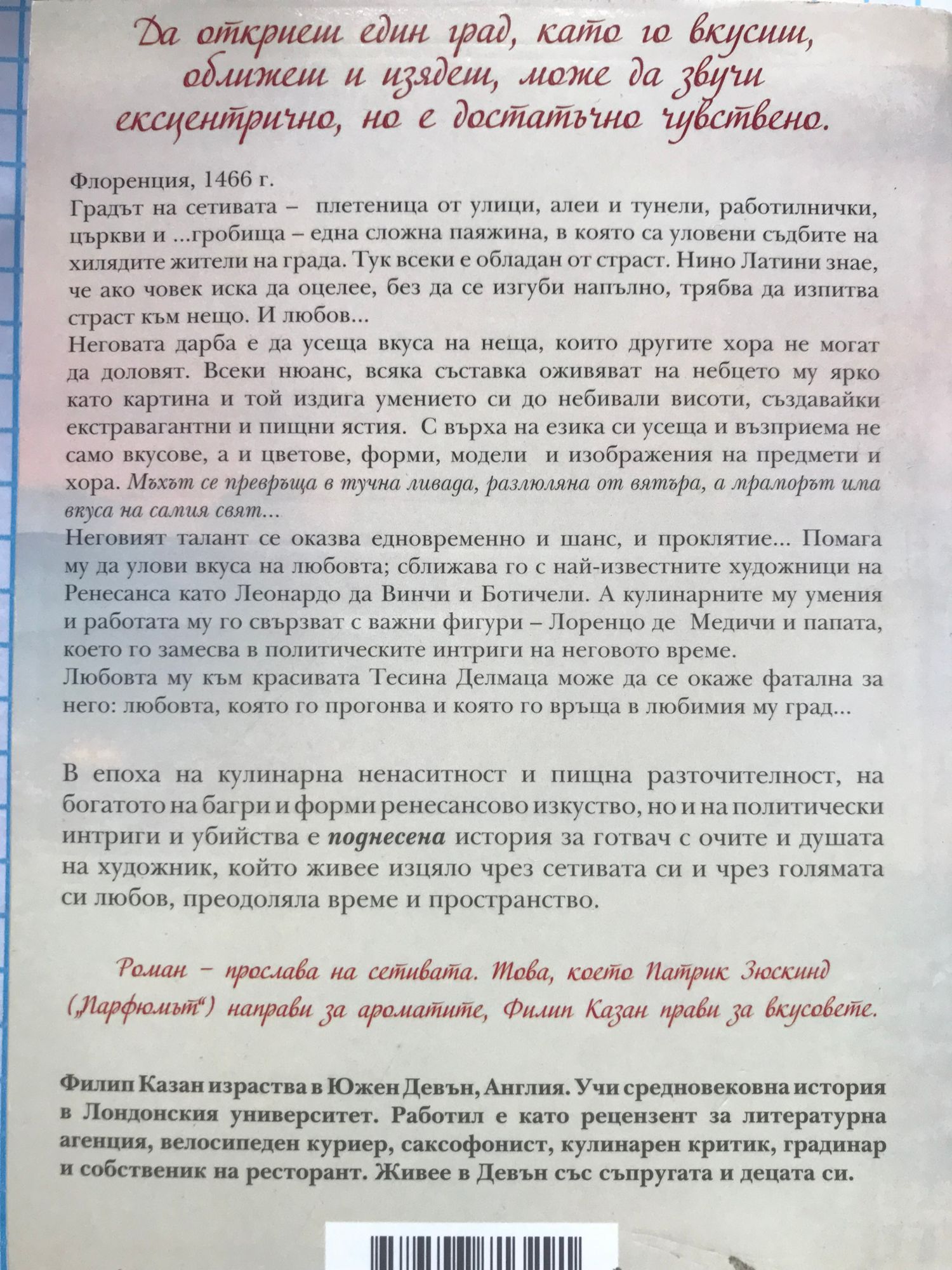 Кулинарна ненаситност, желание за власт, копнеж за любов - страст към живота Да откриеш един град, като го вкусиш, оближеш и изядеш, може да звучи ексцентрично, но е достатъчно чувствено. Флоренция, 1466 г. Градът на сетивата – плетеница от улици, алеи и тунели, работилнички, църкви и ...гробища – една сложна паяжина, в която са уловени съдбите на хилядите жители на града. Тук всеки е обладан от страст. Нино Латини знае, че ако човек иска да оцелее, без да се изгуби напълно, трябва да изпитва страст към нещо. И любов... Неговата дарба е да усеща вкуса на неща, които другите хора не могат да доловят. Всеки нюанс, всяка съставка оживяват на небцето му ярко като картина и той издига умението си до небивали висоти, създавайки екстравагантни и пищни ястия. С върха на езика си усеща и възприема не само вкусове, а и цветове, форми, модели и изображения на предмети и хора. Мъхът се превръща в тучна ливада, разлюляна от вятъра, а мраморът има вкуса на самия свят... Неговият талант се оказва едновременно и шанс, и проклятие... Помага му да улови вкуса на любовта; сближава го с най-известните художници на Ренесанса като Леонардо да Винчи и Ботичели. А кулинарните му умения и работата му го свързват с важни фигури – Лоренцо де Медичи и папата, което го замесва в политическите интриги на неговото време. Любовта му към красивата Тесина Делмаца може да се окаже фатална за него: любовта, която го прогонва и която го връща в любимия му град... В епоха на кулинарна ненаситност и пищна разточителност, на богатото на багри и форми ренесансово изкуство, но и на политически интриги и убийства е поднесена история за готвач с очите и душата на художник, който живее изцяло чрез сетивата си и чрез голямата си любов, преодоляла време и пространство. Роман - прослава на сетивата. Това, което Патрик Зюскинд („Парфюмът”) направи за ароматите, Филип Казан прави за вкусовете.