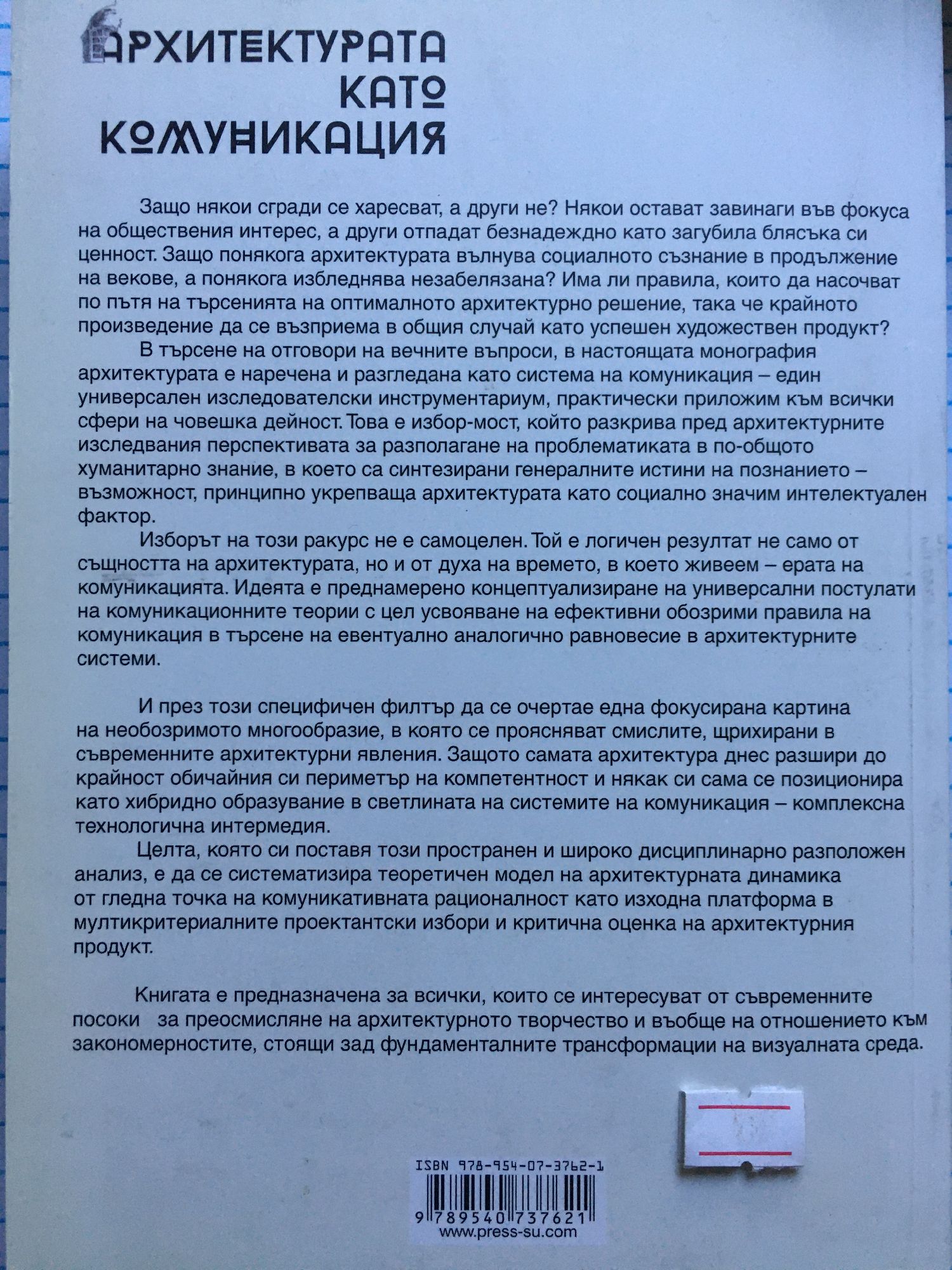 Защо някои сгради се харесват, а други не? Някои остават завинаги във фокуса на обществения интерес, а други отпадат безнадеждно като загубила блясъка си ценност. Защо понякога архитектурата вълнува социалното съзнание в продължение на векове, а понякога избледнява незабелязана? Има ли правила, които да насочват по пътя на търсенията на оптималното архитектурно решение, така че крайното произведение да се възприема в общия случай като успешен художествен продукт? В търсене на отговори на вечните въпроси, в настоящата монография архитектурата е наречена и разгледана като система на комуникация - един универсален изследователски инструментариум, практически приложим към всички сфери на човешка дейност. Това е избор-мост, който разкрива пред архитектурните изследвания перспективата за разполагане на проблематиката в по-общото хуманитарно знание, в което са синтезирани генералните истини на познанието - възможност, принципно укрепваща архитектурата като социално значим интелектуален фактор. Изборът на този ракурс не е самоцелен. Той е логичен резултат не само от същността на архитектурата, но и от духа на времето, в което живеем - ерата на комуникацията. Идеята е преднамерено концептуализиране на универсални постулати на комуникационните теории с цел усвояване на ефективни, обозрими правила на комуникация в търсене на евентуално аналогично равновесие в архитектурните системи. И през този специфичен филтър да се очертае една фокусирана картина на необозримото многообразие, в която се проясняват смислите, щрихирани в съвременните архитектурни явления. Защото самата архитектура днес разшири до крайност обичайния си периметър на компетентност и някак си сама се позиционира като хибридно образувание в светлината на системите на комуникация - комплексна технологична интермедия. Целта, която си поставя този пространен и широко дисциплинарно разположен анализ, е да се систематизира теоретичен модел на архитектурната динамика от гледна точка на комуникативната рационалност като изходна платформа в мултикритериалните проектантски избори и критична оценка на архитектурния продукт. Книгата е предназначена за всички, които се интересуват от съвременните посоки за преосмисляне на архитектурното творчество и въобще на отношението към закономерностите, стоящи зад фундаменталните трансформации на визуалната среда.