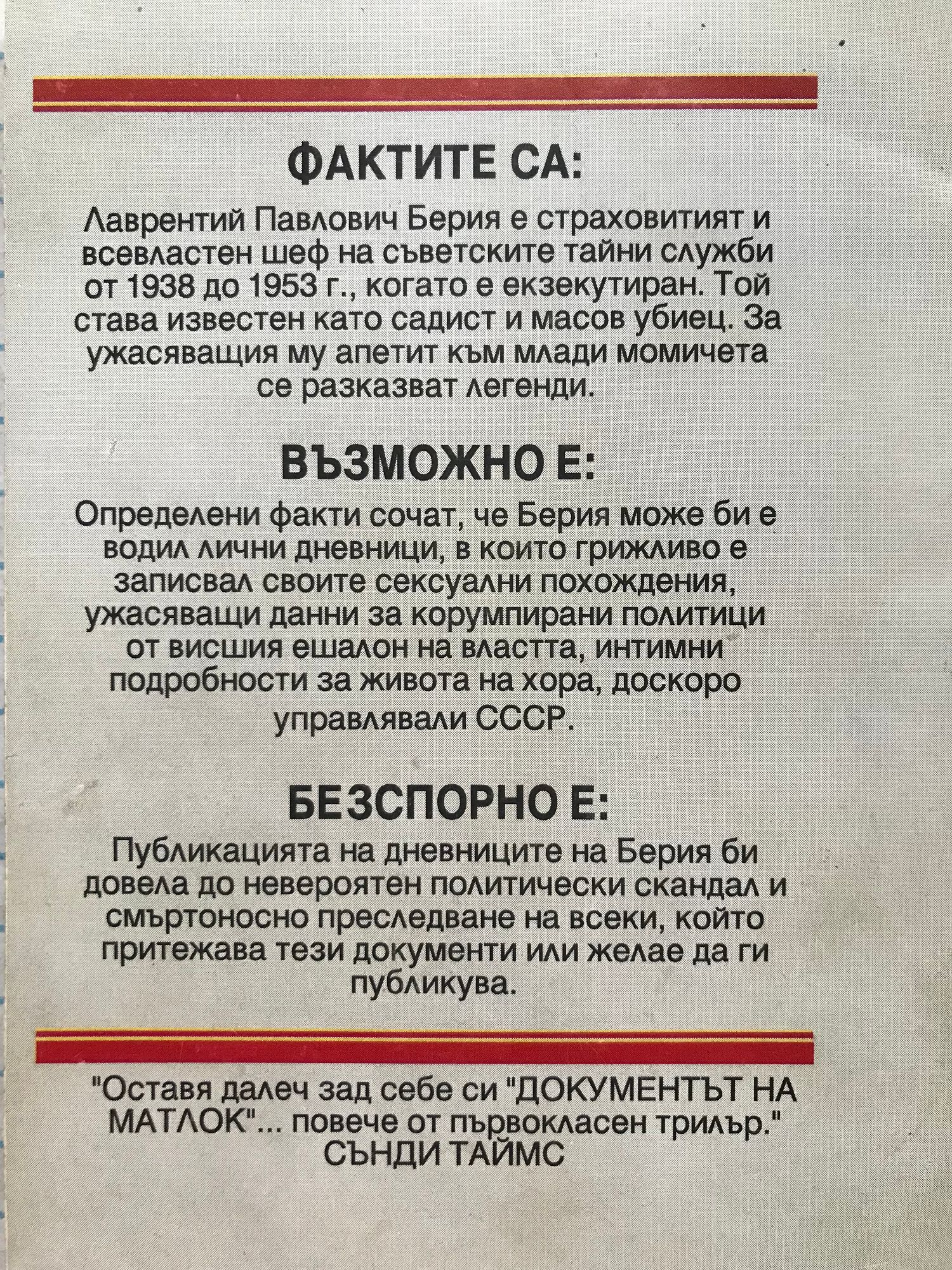 Фактите са: Лаврентий Павлович Берия е страховитият и всевластен шеф на съветските тайни служби от 1938 до 1953 г., когато е екзекутиран. Той става известен като садист и масов убиец. За ужасяващия му апетит към млади момичета се разказват легенди. Възможно е: Определени факти сочат, че Берия може би е водил лични дневници, в които грижливо е записвал своите сексуални похождения, ужасяващи данни за корумпирани политици от висшия ешелон на властта, интимни подробности за живота на хора, доскоро управлявали СССР. Безспорно е: Публикацията на дневниците на Берия би довела до невероятен политически скандал и смъртоносно преследване на всеки, който притежава тези документи или желае да ги публикува.