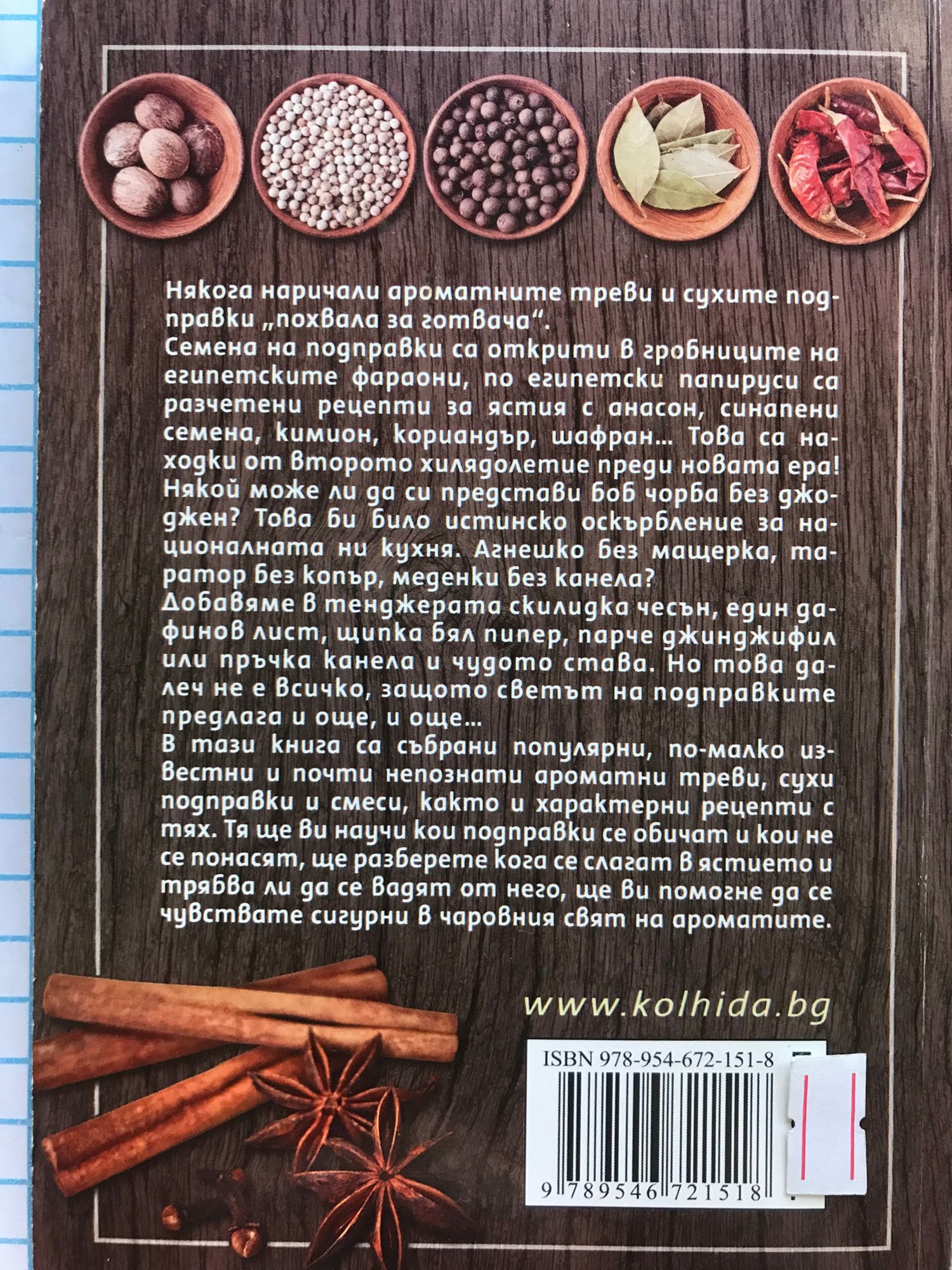 Някога наричали ароматните треви и сухите подправки "похвала за готвача". Семена на подправки са открити в гробниците на египетските фараони, по египетски папируси са разчетени рецепти за ястия с анасон, синапени семена, кимион, кориандър, шафран... Това са находки от второто хилядолетие преди новата ера! Някой може ли да си представи боб чорба без джоджен? Това би било същинско оскърбление за националната ни кухня. Агнешко без мащерка, таратор без копър, меденки без канела? В тази книга са събрани популярни, по-малко известни и почти непознати ароматни треви, сухи подправки и смеси, както и характерни рецепти с тях. Тя ще ви научи кои подправки се обичат и кои не се понасят, ще разберете кога се слагат в ястието и трябва ли да се вадят от него, ще ви помогне да се чувствате сигурни в чаровния свят на ароматите.