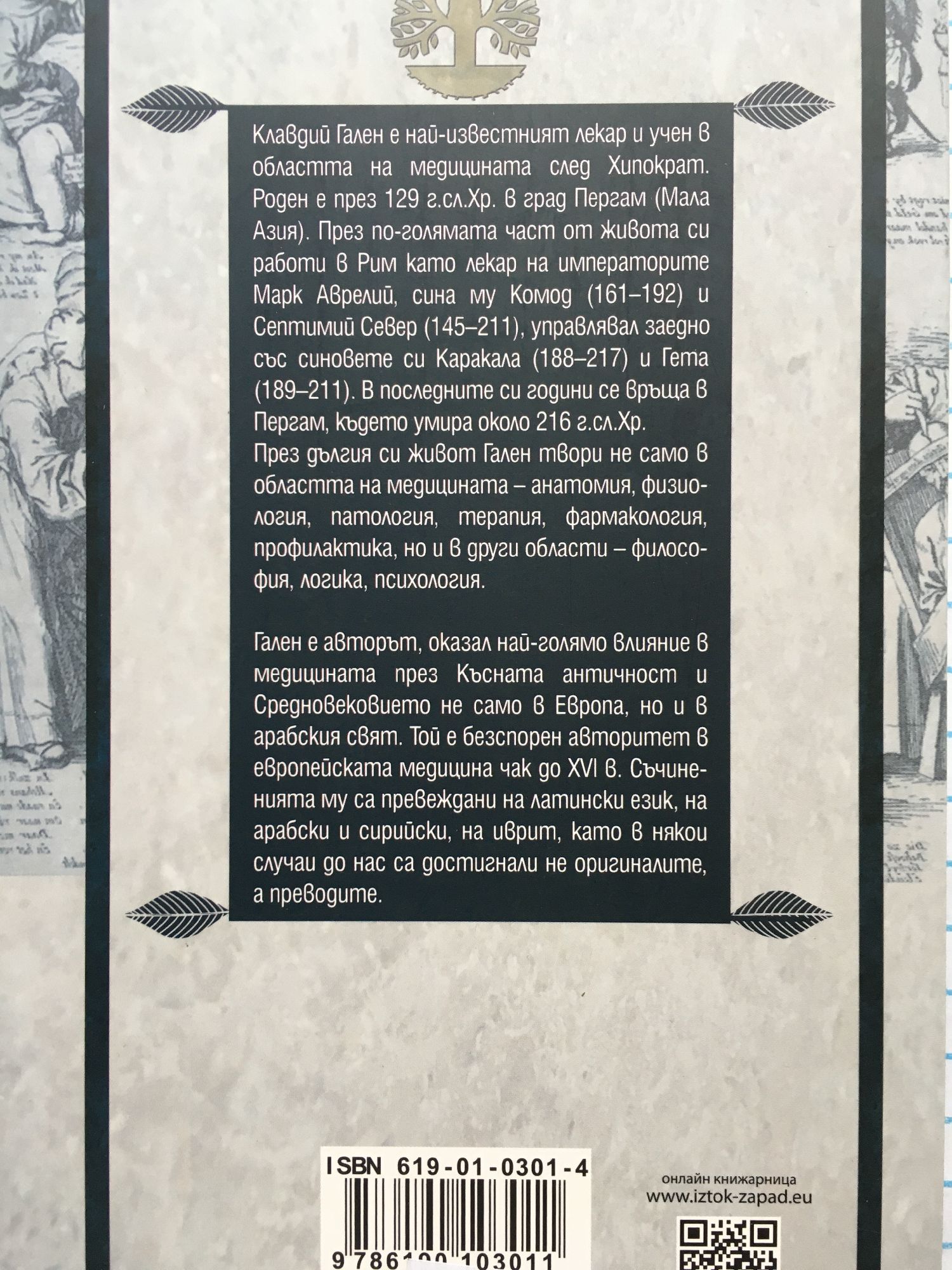 Клавдий Гален е най-известният лекар и учен в областта на медицината след Хипократ, роден през 129 г.сл.Хр. в град Пергам (Мала Азия). През по-голямата част от живота си работи в Рим като лекар на императорите Марк Аврелий, сина му Комод (161 - 192) и Септимий Север (145 - 211), управлявал заедно със синовете си Каракала (188 - 217) и Гета (189 - 211). В последните години се връща в Пергам, където почива около 216 г.сл.Хр. През дългия си живот Гален твори не само в медицинските области - анатомия, физиология, патология, терапия, фармакология, профилактика, но и в области като философията, логиката, психологията. Гален е авторът, оказал най-голямо влияние през Късната античност и Средновековието не само в Европа, но и в арабския свят. Той е безспорен авторитет в европейската медицина чак до ХVІ в. Съчиненията му са превеждани на латински език, на арабски и на сирийски, на иврит, като в някои случаи до нас са достигнали не оригиналите, а преводите.