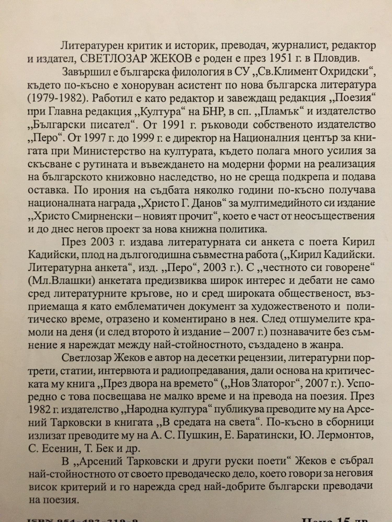 Литературен критик и историк, преводач, журналист, редактор и издател, СВЕТЛОЗАР ЖЕКОВ е роден е през 1951 г. в Пловдив. Завършил е българска филология в СУ "Св.Климент Охридски", където по-късно е хоноруван асистент по нова българска литература (1979-1982). Работил е като редактор и завеждащ редакция "Поезия" при Главна редакция "Култура" на БНР, в сп. "Пламък" и издателство "Български писател". От 1991 г. ръководи собственото издателство "Перо". От 1997 г. до 1999 г. е директор на Националния център за книгата при Министерство на културата, където полага много усилия за скъсване с рутината и въвеждането на модерни форми на реализация на българското книжовно наследство, но не среща подкрепа и подава оставка. По ирония на съдбата няколко години по-късно получава националната награда, Дристо Г. Данов" за мултимедийното си издание "Христо Смирненски - новият прочит", което е част от неосъществения и до днес негов проект за нова книжна политика. През 2003 г. издава литературната си анкета с поета Кирил Кадийски, плод на дългогодишна съвместна работа ("Кирил Кадийски. Литературна анкета", изд. "Перо", 2003 г.). С "честното си говорене" (Мл.Влашки) анкетата предизвиква широк интерес и дебати не само сред литературните кръгове, но и сред широката общественост, възприемаща я като емблематичен документ за художественото и политическо време, отразено и коментирано в нея. След отшумелите крамоли на деня (и след второто й издание - 2007 г.) познавачите без съмнение я нареждат между най-стойностното, създадено в жанра. Светлозар Жеков е автор на десетки рецензии, литературни портрети, статии, интервюта и радиопредавания, дали основа на критическата му книга "През двора на времето" ("Нов Златорог", 2007 г.). Успоредно с това посвещава не малко време и на превода на поезия. През 1982 г. издателство"Народна култура" публикува преводите му на Арсений Тарковски в книгата "В средата на света". По-късно в сборници излизат преводите му на А. С. Пушкин, Е. Баратински, Ю. Лермонтов, С. Есенин, Т. Бек и др. В "Арсений Тарковски и други руски поети" Жеков е събрал най-стойностното от своето преводаческо дело, което говори за неговия висок критерий и го нарежда сред най-добрите български преводачи на поезия.