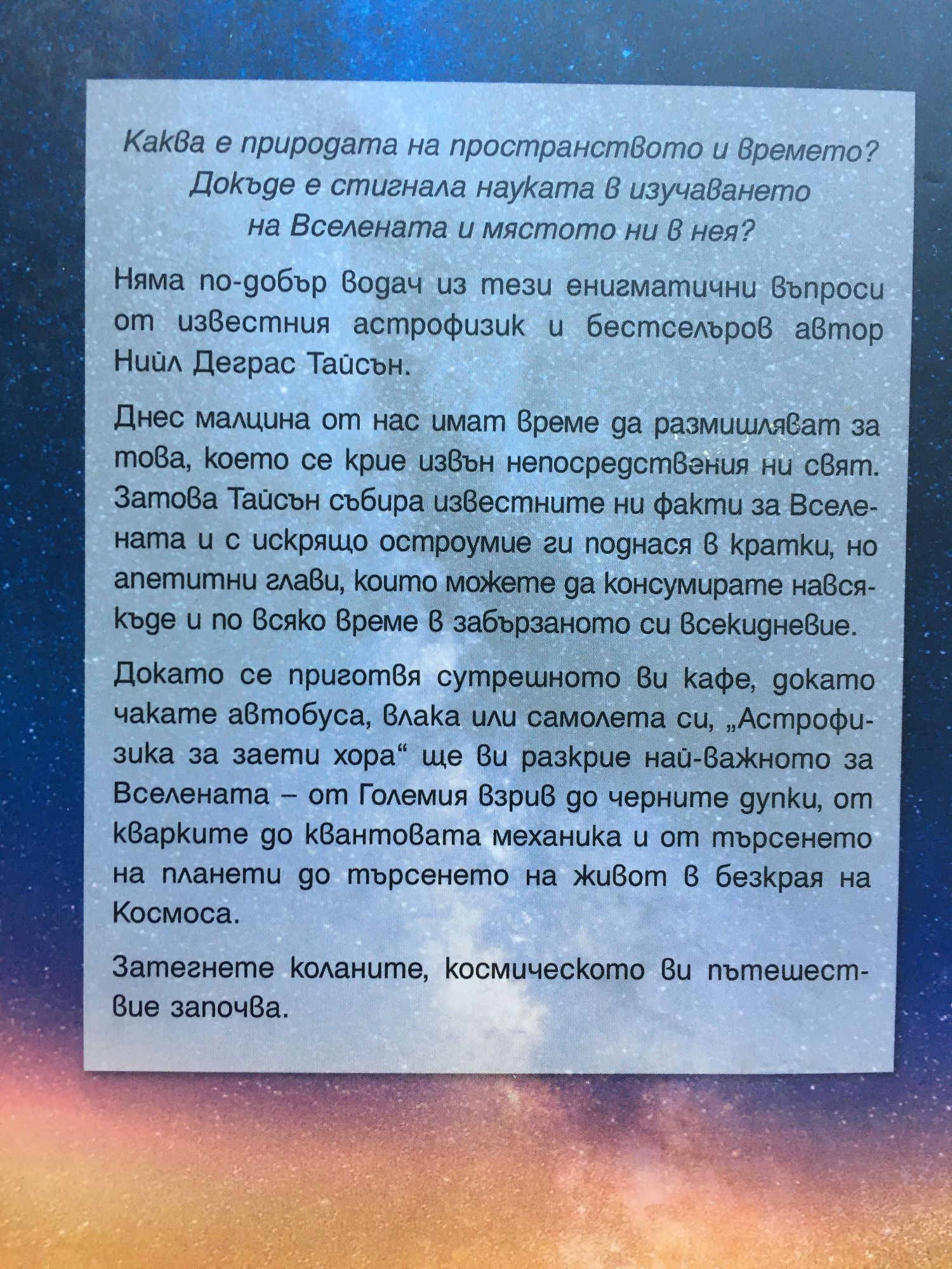Каква е природата на пространството и времето? Докъде е стигнала науката в изучаването на Вселената и мястото ни в нея? Няма по-добър водач из тези енигматични въпроси от известния астрофизик и бестселъров автор Нийл Деграс Тайсън. Днес малцина от нас имат време да размишляват за това, което се крие извън непосредствения ни свят. Затова Тайсън събира известните ни факти за Вселената и с искрящо остроумие ги поднася в кратки, но апетитни глави, които можете да консумирате навсякъде и по всяко време в забързаното си всекидневие. Докато се приготвя сутрешното ви кафе, докато чакате автобуса, влака или самолета си, „Астрофизика за заети хора“ ще ви разкрие най-важното за Вселената – от Големия взрив до черните дупки, от кварките до квантовата механика и от търсенето на планети до търсенето на живот в безкрая на Космоса. Затегнете коланите, космическото ви пътешествие започва.