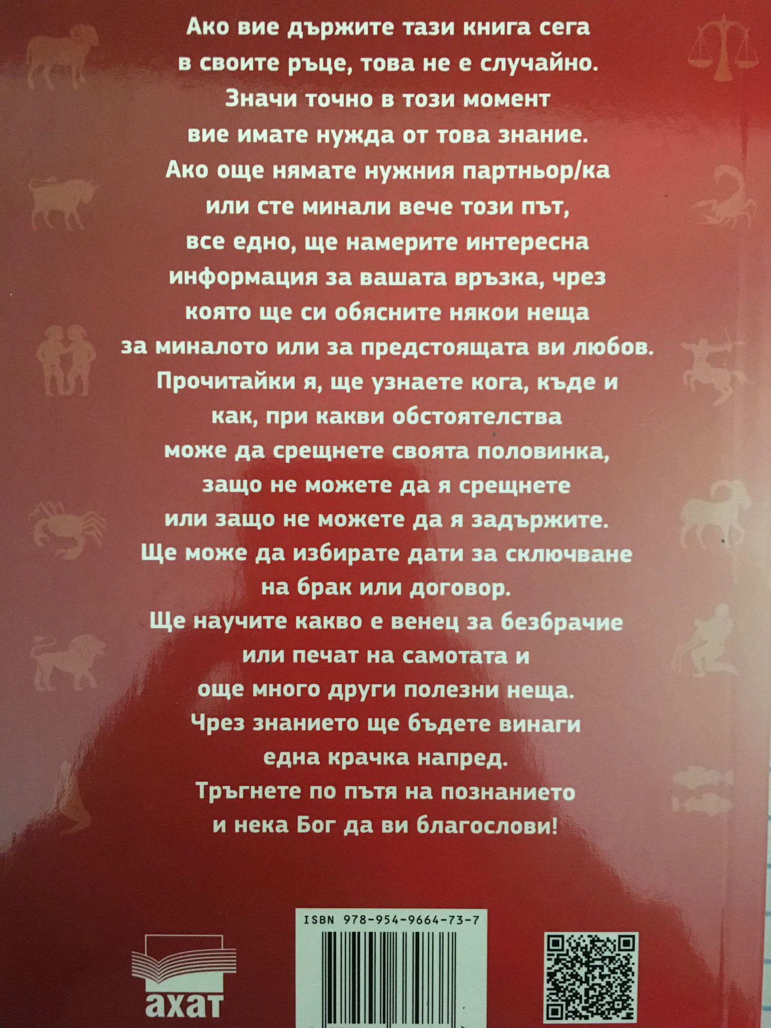 Ако вие държите тази книга сега в своите ръце, това не е случайно. Значи точно в този момент вие имате нужда от това знание. Ако още нямате нужния партньор/ка или сте минали вече този път, все едно, ще намерите интересна информация за вашата връзка, чрез която ще си обясните някои неща за миналото или за предстоящата ви любов. Прочитайки я, ще узнаете кога, къде и как, при какви обстоятелства може да срещнете своята половинка, защо не можете да я срещнете или защо не можете да я задържите. Ще може да избирате дати за сключване на брак или договор. Ще научите какво е венец за безбрачие или печат на самотата и още много други полезни неща. Чрез знанието ще бъдете винаги една крачка напред. Тръгнете по пътя на познанието и нека Бог да ви благослови!