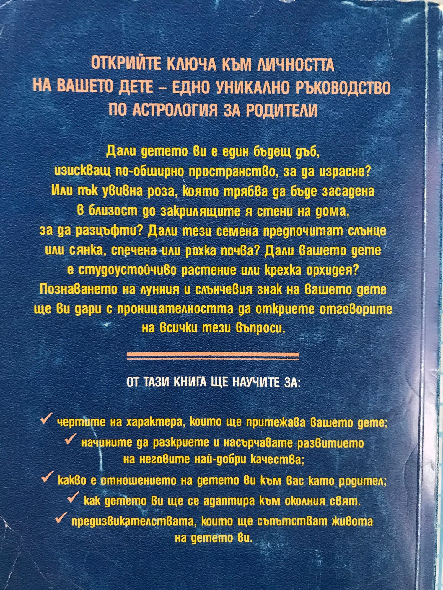 Дали детето ви е един бъдещ дъб, изискващ по-обширно пространство, за да израсне? Или пък увивна роза, която трябва да бъде засадена в близост до закрилящите я стени на дома, за да разцъфти? Дали тези семена предпочитат слънце или сянка, спечена или рохка почва? Дали вашето дете е студоустойчиво растение или крехка орхидея? Познаването на лунния и слънчевия знак на вашето дете ще ви дари с проницателността да откриете отговорите на всички тези въпроси. От тази книга ще научите за: чертите на характера, които ще притежава вашето дете; начините да разкриете и насърчавате развитието на неговите най-добри качества; какво е отношението на детето ви към вас като родител; как детето ви ще се адаптира към околния свят; предизвикателствата, които ще съпътстват живота на детето ви.