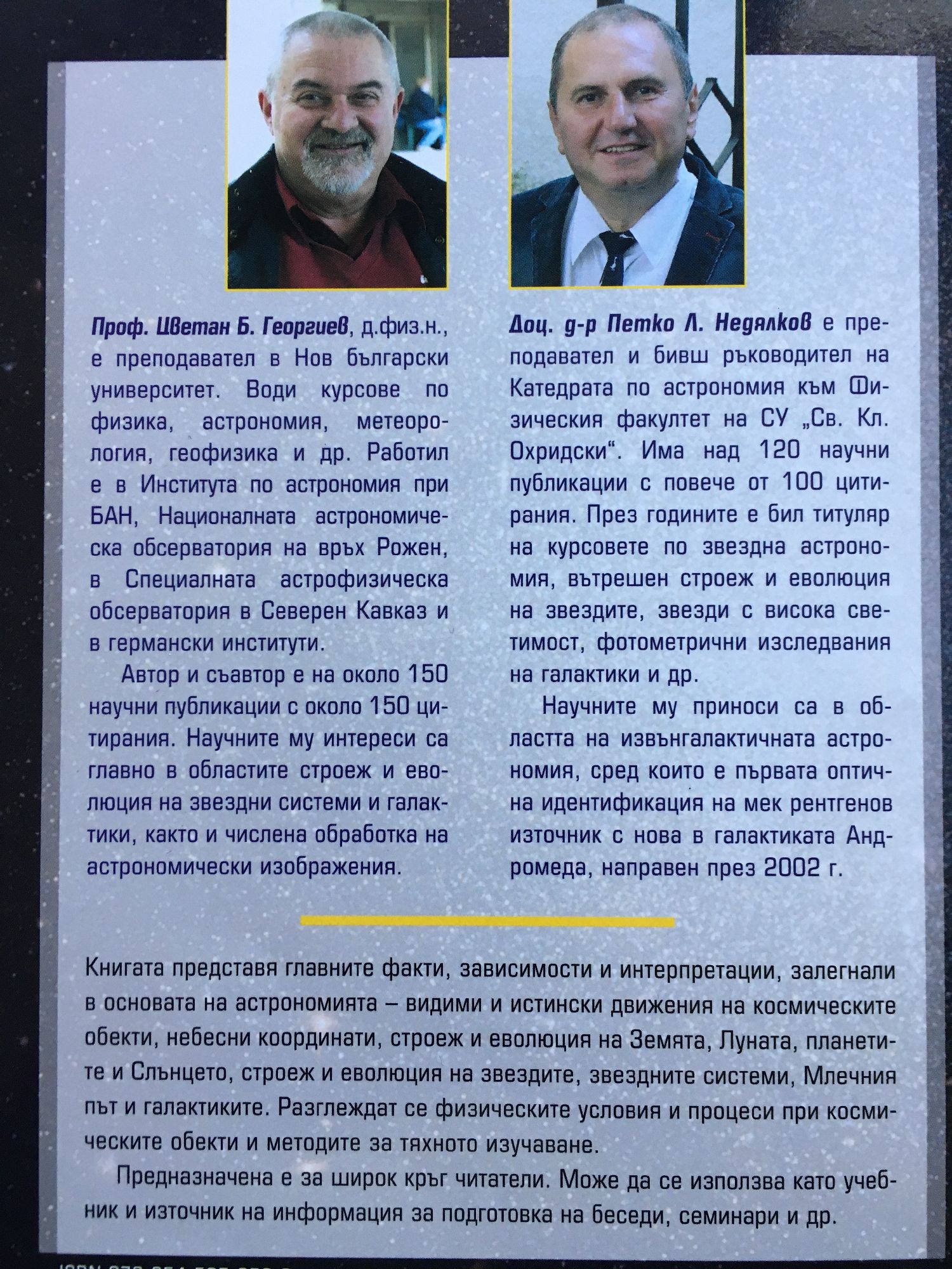 Книгата представя главните факти, зависимости и интерпретации, залегнали в основата на Астрономията - видими и истински движения на космическите обекти, небесни координати, строеж и еволюция на Земята, Луната, планетите и Слънцето, строеж и еволюция на звездите, звездните системи, Млечния път и галактиките. Разглеждат се физическите условия и процеси при космическите обекти и методите за тяхното изучаване. Предназначена е за широк кръг читатели. Може да се използва като учебник и източник на информация за подготовка на беседи, семинари и др.