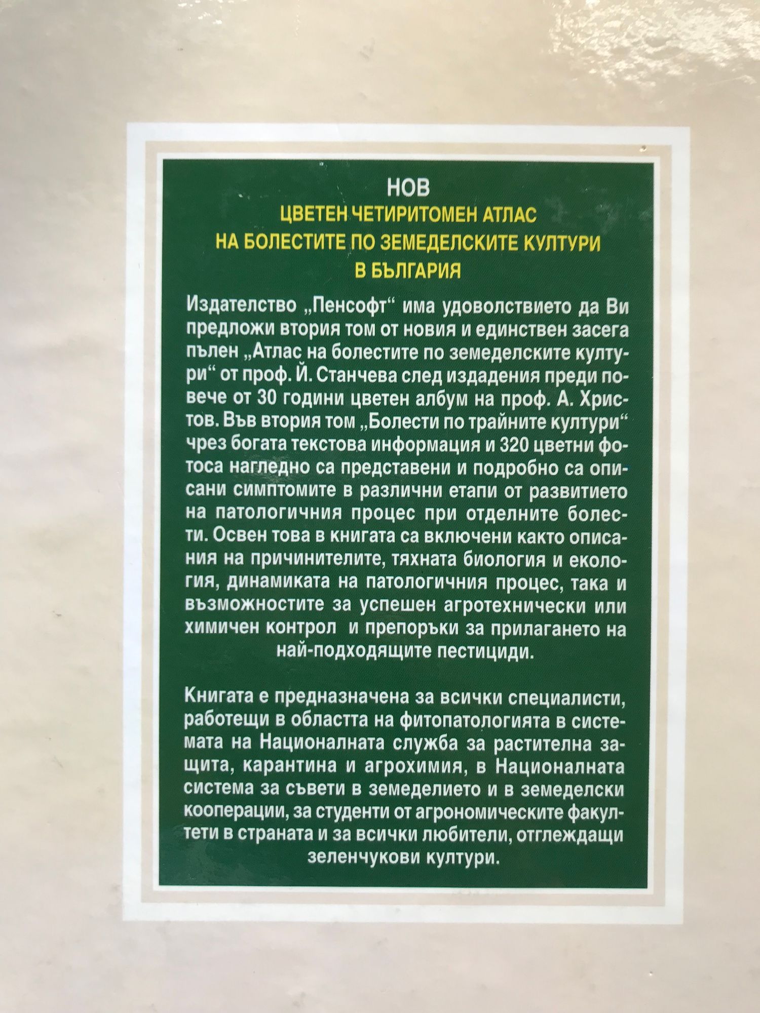 Издателство "Пенсофт" ви предлага втория том от новия и единствен засега пълен "Атлас на болестите по земеделските култури" от проф. Й. Станчева след издадения преди повече от 30 години цветен албум на проф. А. Христов. Във втория том "Болести по трайните култури" чрез богата текстова информация и 320 цветни фотоса нагледно са представени и подробно описани симптомите на различните етапи от развитието на патологичния процес при отделните болести. Освен това в книгата са включени както описания на причинителите, тяхната биология и екология, динамиката на патологичния процес, така и възможностите за успешен агротехнически или химичен контрол и препоръки за прилагането на най-подходящите пестициди.