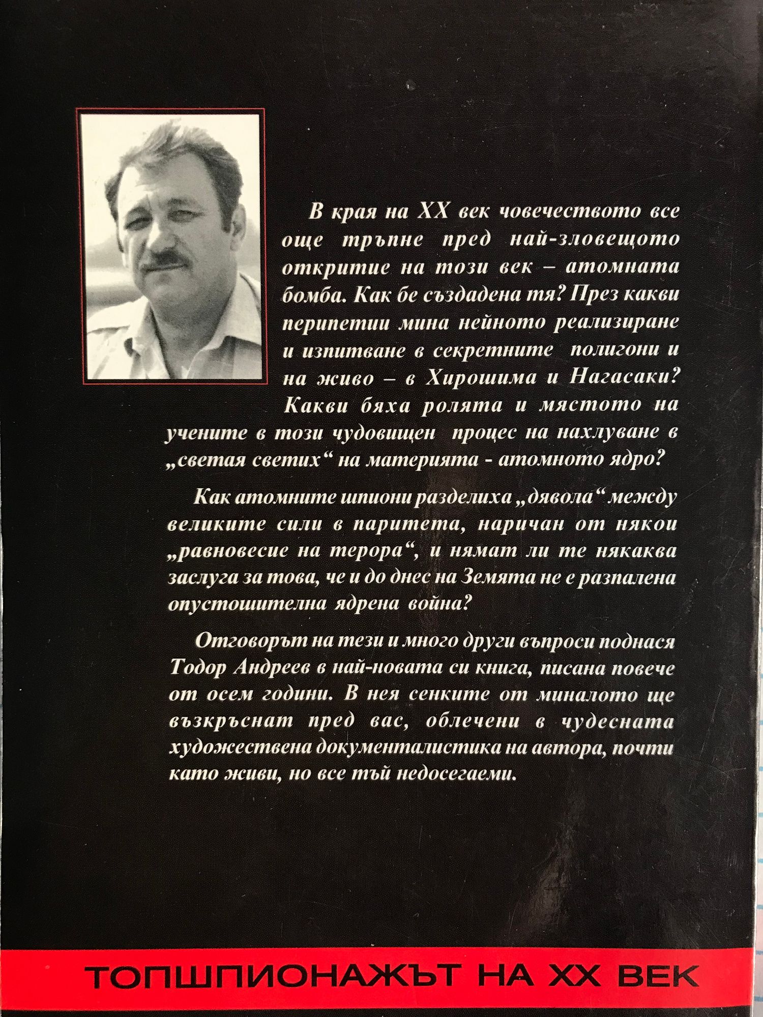 Човечеството все още тръпне пред най-зловещото откритие на XX век - атомната бомба. Как бе създадена тя? През какви перипетии мина нейното реализиране и изпитване в секретните полигони и на живо - в Хирошима и Нагасаки? Какви бяха ролята и мястото на учените в този чудовищен процес на нахлуване в "светая светих" на материята - атомното ядро? Как атомните шпиони разделиха "дявола" между великите сили в паритета, наричан от някои "равновесие на терора", и нямат ли те някаква заслуга за това, че и до днес на Земята не е разпалена опустошителна ядрена война? Отговорът на тези и много други въпроси поднася Тодор Андреев в най-новата си книга, писана повече от осем години. В нея сенките от миналото ще възкръснат пред вас, облечени в чудесната художествена документалистика на автора, почти като живи, но все тъй недосегаеми.