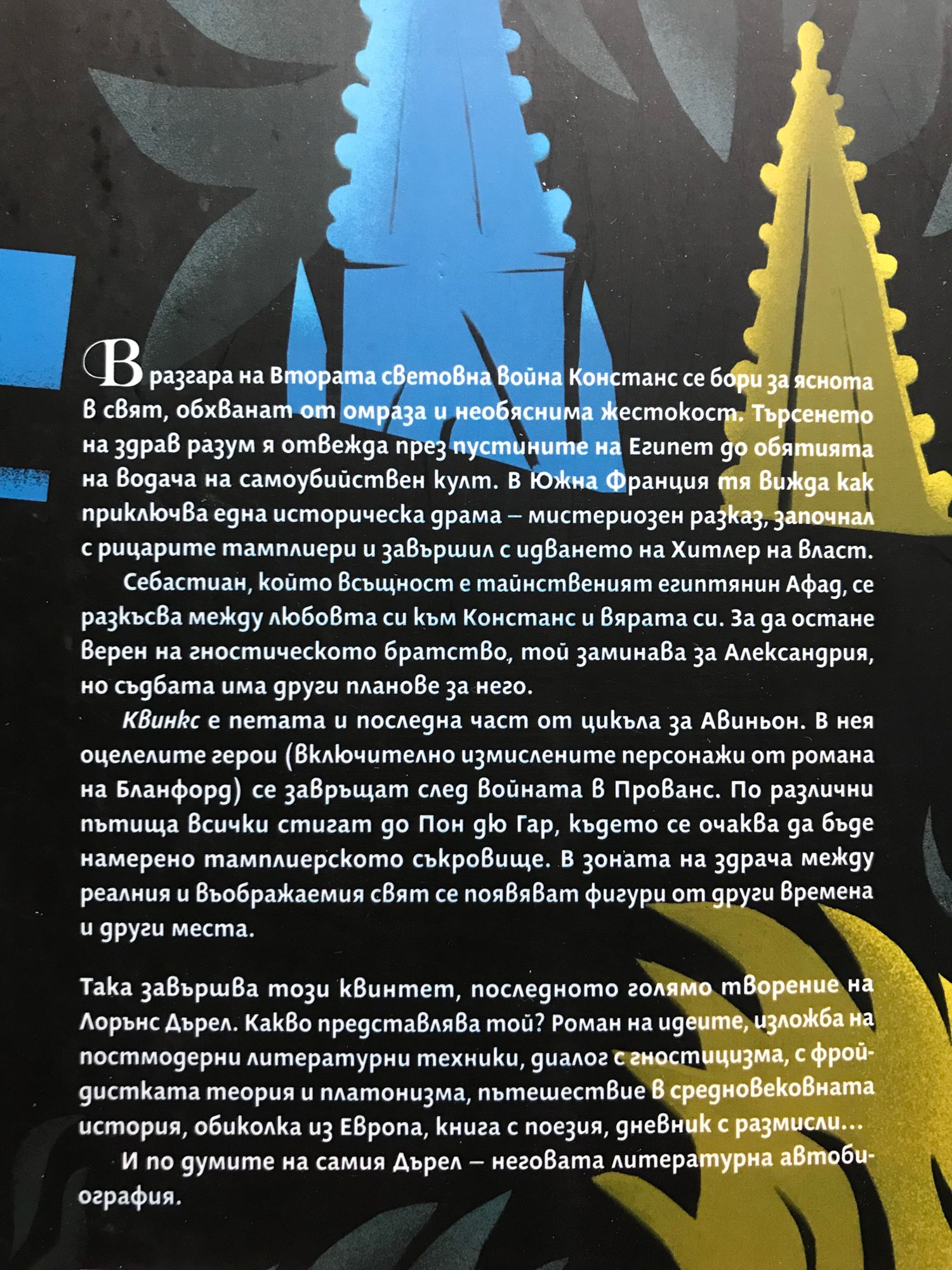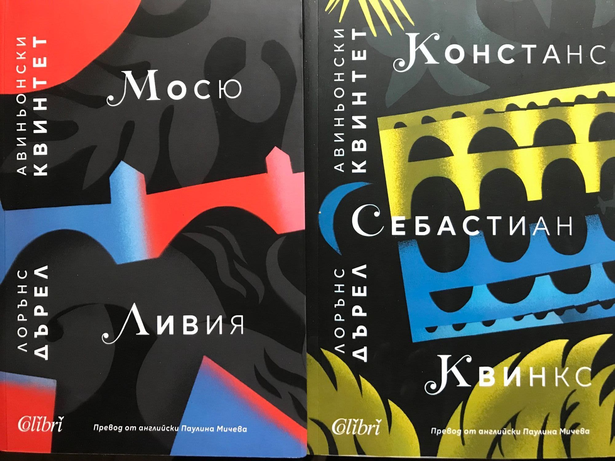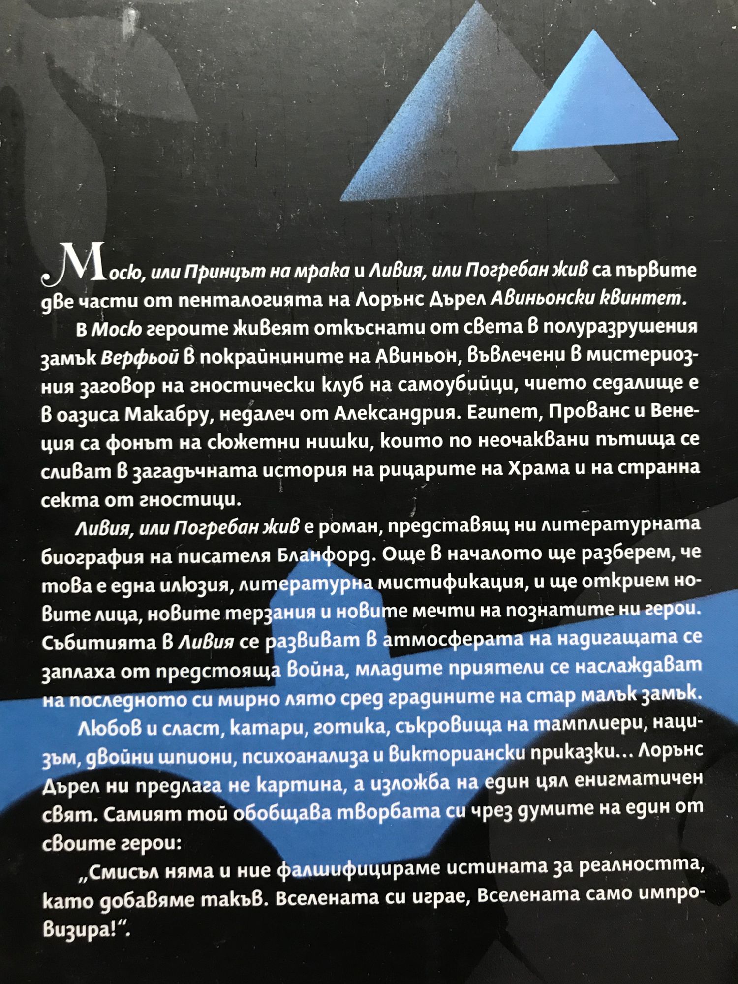Книга 1: „Мосю, или Принцът на мрака“ и „Ливия, или Погребан жив“ са първите две части от пенталогията на Лорънс Дърел „Авиньонски квинтет“. В „Мосю” героите живеят откъснати от света в полуразрушения замък „Верфьой“ в покрайнините на Авиньон, въвлечени в мистериозния заговор на гностически клуб на самоубийци, чието седалище е в оазиса Макабру, недалеч от Александрия. Египет, Прованс и Венеция са фонът на сюжетни нишки, които по неочаквани пътища се сливат в загадъчната история на рицарите на Храма и на странна секта от агностици. „Ливия, или Погребан жив” е роман, представящ ни литературната биография на писателя Бланфорд. Още в началото ще разберем, че това е една илюзия, литературна мистификация, и ще открием новите лица, новите съжаления и новите мечти на познатите ни герои. Събитията в „Ливия” се развиват в атмосферата на надигащата се заплаха от предстояща война, като групата млади приятели се наслаждават на последното си мирно лято сред градините на стар малък замък. Любов и сласт, катари, готика, съкровища на тамплиери, нацизъм, двойни шпиони, психоанализа и викториански приказки… Лорънс Дърел ни предлага не картина, а изложба на един цял енигматичен свят. Самият той обобщава творбата си чрез думите на един от своите герои: „Смисъл няма и ние фалшифицираме истината за реалността, като добавяме такъв. Вселената си играе, Вселената само импровизира!“. Книга 2: В разгара на Втората световна война Констанс се бори за яснота в свят, обхванат от омраза и необяснима жестокост. Търсенето на здрав разум я отвежда през пустините на Египет до обятията на водача на самоубийствен култ. В Южна Франция тя вижда как приключва една историческа драма – мистериозен разказ, започнал с рицарите тамплиери и завършил с идването на Хитлер на власт. Себастиан, който всъщност е тайнственият египтянин Афад, се разкъсва между любовта си към Констанс и вярата си. За да остане верен на гностическото братство, той заминава за Александрия, но съдбата има други планове за него. „Квинкс“ е петата и последна част от цикъла за Авиньон. В него оцелелите герои (включително измислените персонажи от романа на Бланфорд) се завръщат след войната в Прованс. По различни пътища всички стигат до Пон дю Гар, където се очаква да бъде намерено тамплиерското съкровище. В зоната на здрача между реалния и въображаемия свят се появяват фигури от други времена и други места. Така завършва този квинтет, последното голямо творение на Лорънс Дърел. Какво представлява той? Роман на идеите, изложба на постмодерни литературни техники, диалог с гностицизма, с фройдистката теория и платонизма, пътешествие в средновековната история, обиколка из Европа, книга с поезия, дневник с размисли… И по думите на самия Дърел – неговата литературна автобиография.