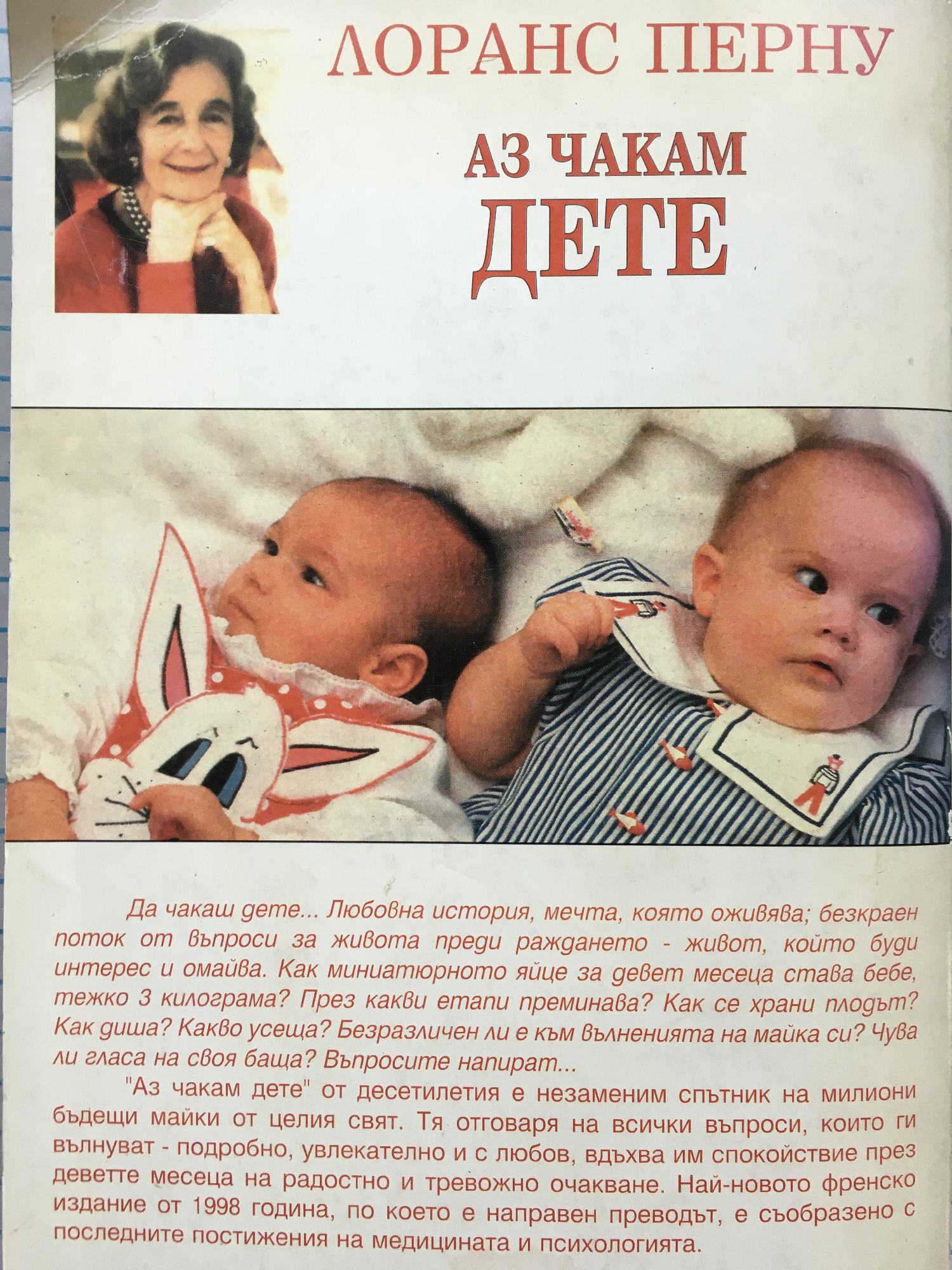 „Да чакаш дете... Любовна история, мечта, която оживява; безкраен поток от въпроси за живота преди раждането - живот, който буди интерес и омайва. Как миниатюрното яйце за девет месеца става бебе, тежко 3 килограма? През какви етапи преминава? Как се храни плодът? Как диша? Какво усеща? Безразличен ли е към вълненията на майка си? Чува ли гласа на своя баща? Въпросите напират... " „Аз чакам дете" от десетилетия е незаменим спътник на милиони бъдещи майки от целия свят. Тя отговаря на всички въпроси, които ги вълнуват - подробно, увлекателно и с любов, вдъхва им спокойствие през деветте месеца на радостно и тревожно очакване. Най-новото френско издание от 1998 година, по което е направен преводът, е съобразено с последните постижения на медицината и психологията.