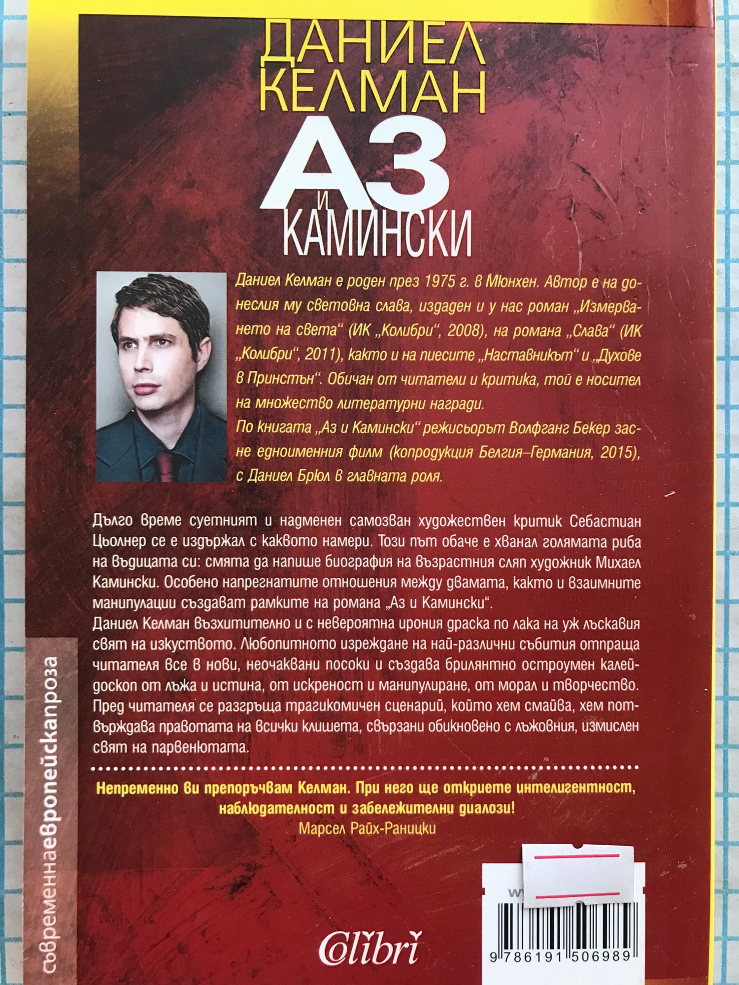Дълго време суетният и надменен самозван критик на изкуството Себастиан Цьолнер се е издържал с каквото намери. Този път обаче е хванал голямата риба на въдицата си: смята да напише биография на възрастния сляп художник Михаел Камински. Особено напрегнатите отношения между двамата, както и взаимните манипулации създават рамките на романа на Даниел Келман „Аз и Камински“. Даниел Келман възхитително и с невероятна ирония драска по лака на уж лъскавия свят на изкуството. Любопитното изреждане на най-различни събития отпраща читателя все в нови, неочаквани посоки и създава брилянтно остроумен калейдоскоп от лъжа и истина, от искреност и манипулиране, от морал и творчество. Пред читателя се разгръща трагикомичен сценарий, който хем смайва, хем потвърждава правотата на всички клишета, свързани обикновено с лъжовния, измислен свят на парвенютата. Непременно ви препоръчвам Келман. При него ще откриете интелигентност, наблюдателност и забележителни диалози! Марсел Райх-Раницки