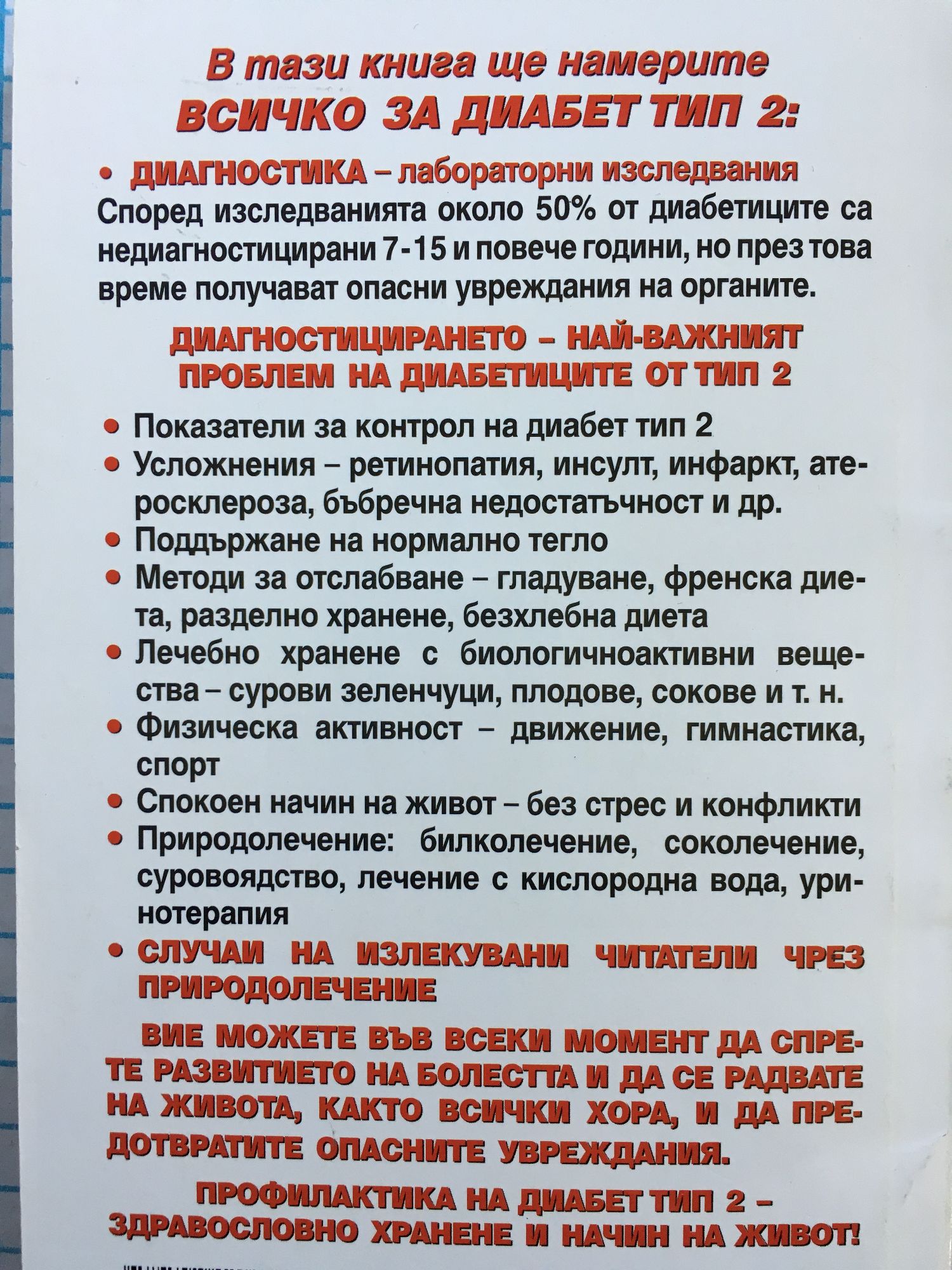 В тази книга ще намерите всичко за диабет тип 2: Диагностика - лабораторни изследвания. Според изследванията около 50% от диабетиците са недиагностицирани 7-15 и повече години, но през това време получават опасни увреждания на органите. Диагностицирането - най-важният проблем на диабетиците от тип 2: Показатели за контрол на диабет тип 2. Усложнения - ретинопатия, инсулт, инфаркт, атеросклероза, бъбречна недостатъчност и др. Поддържане на нормално тегло. Методи за отслабване - гладуване, френска диета, разделно хранене, безхлебна диета. Лечебно хранене с биологичноактивни вещества - сурови зеленчуци, плодове, сокове и т.н. Физическа активност - движение, гимнастика, спорт. Спокоен начин на живот - без стрес и конфликти. Природолечение: билколечение, соколечение, суровоядство, лечение с кислородна вода, уринотерапия. Случаи на излекувани читатели чрез природолечение. Вие можете във всеки момент да спрете развитието на болестта и да се радвате на живота, както всички хора, и да предотвратите опасните увреждания. Профилактика на диабет тип 2 - здравословно хранене и начин на живот!