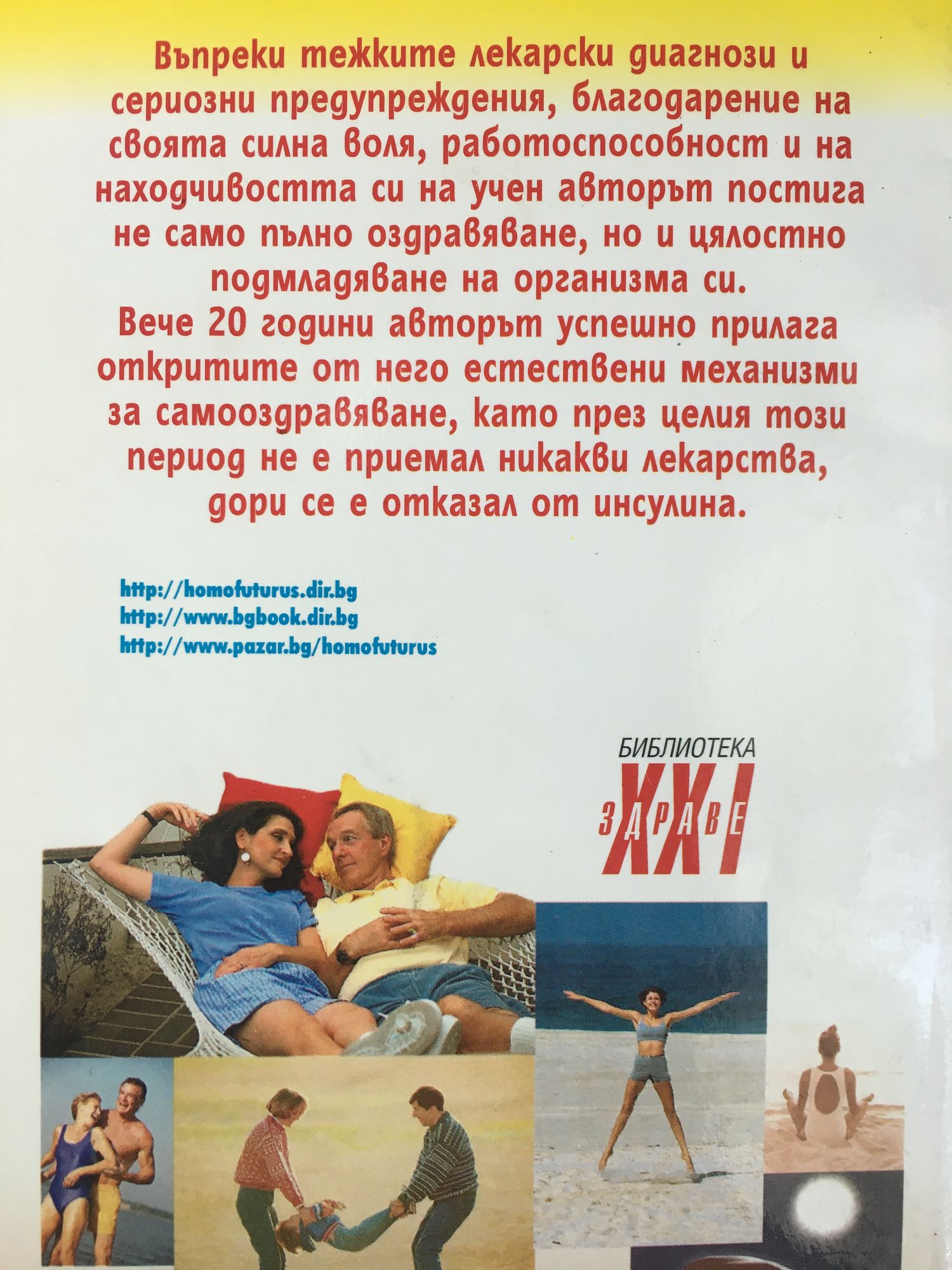 Въпреки тежките лекарски диагнози и сериозни предупреждения, благодарение на своята силна воля, работоспособност и на находчивостта си на учен авторът постига не само пълно оздравяване, но и цялостно подмладяване на организма си. Вече 20 години авторът успешно прилага откритите от него естествени механизми за самооздравяване, като през целия този период не е приемал никакви лекарства, дори се е отказал от инсулина.