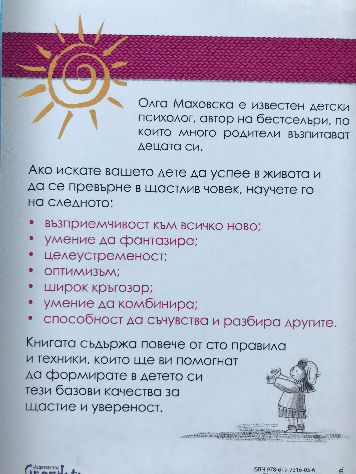 Ако искате вашето дете да успее в живота и да се превърне в щастлив човек, научете го на следното: • възприемчивост към всичко ново; • умение да фантазира; • целеустременост; • оптимизъм; • широк кръгозор; • умение да комбинира; • способност да съчувства и разбира другите. Олга Маховска е известен детски психолог, автор на редица бестселъри, по които много родители възпитават децата си. Книгата "Аз те чувам, разбирам и съм твой приятел, детето ми!" е един безценен пътеводител с повече от сто правила и техники, които ще ви помогнат да формирате в детето си тези базови качества за щастие и увереност.