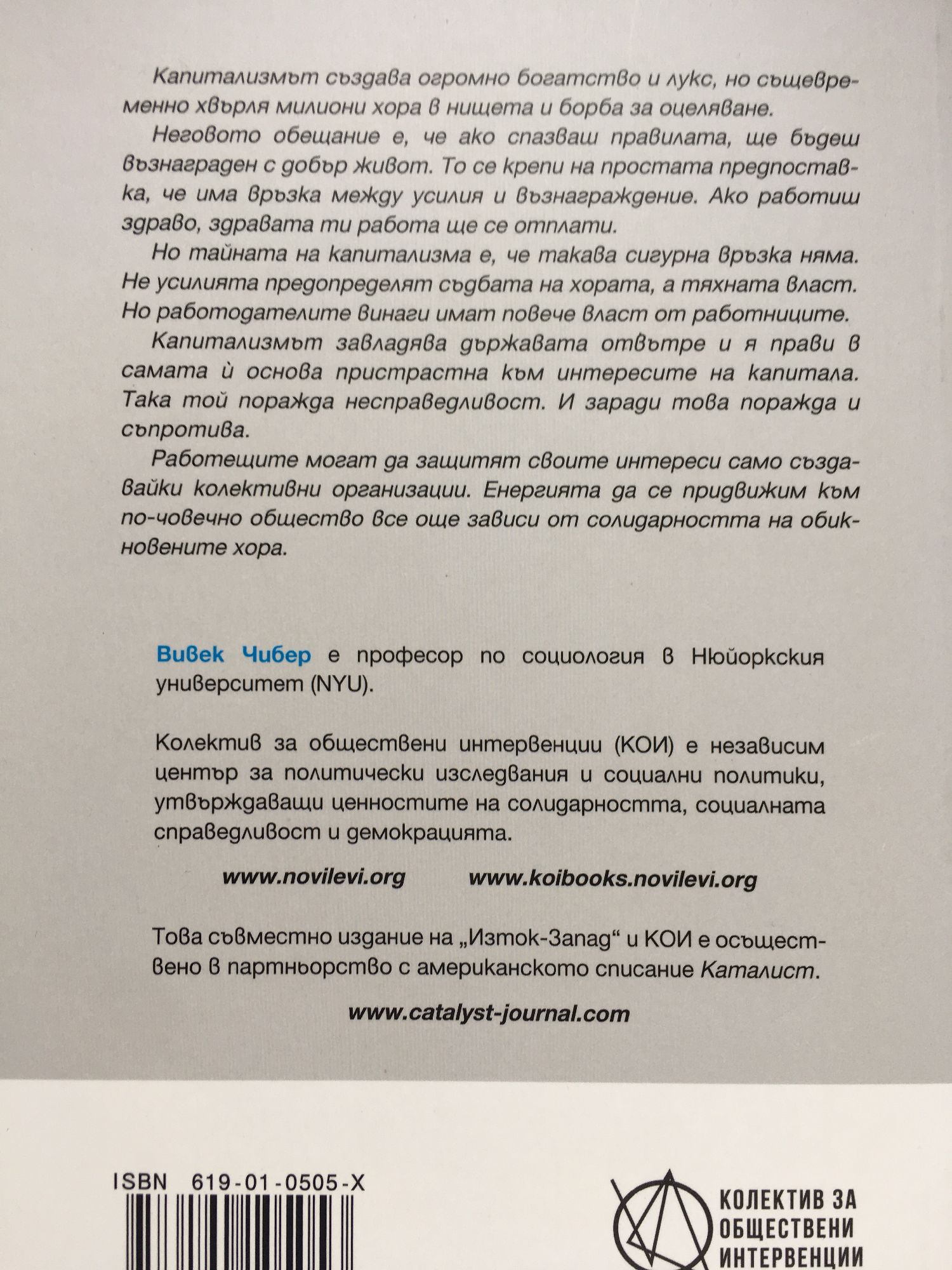 Капитализмът създава огромно богатство и лукс, но същевременно хвърля милиони хора в нищета и борба за оцеляване. Неговото обещание е, че ако спазваш правилата, ще бъдеш възнаграден с добър живот. То се крепи на простата предпоставка, че има връзка между усилия и възнаграждение. Ако работиш здраво, здравата ти работа ще се отплати. Но тайната на капитализма е, че такава сигурна връзка няма. Не усилията предопределят съдбата на хората, а тяхната власт. Но работодателите винаги имат повече власт от работниците. Капитализмът завладява държавата отвътре и я прави в самата ѝ основа пристрастна към интересите на капитала. Така той поражда несправедливост. И заради това поражда и съпротива. Работещите могат да защитят своите интереси само създавайки колективни организации. Енергията да се придвижим към по-човечно общество все още зависи от солидарността на обикновените хора. Колектив за обществени интервенции (КОИ) е независим център за политически изследвания и социални политики, утвърждаващи ценностите на солидарността, социалната справедливост и демокрацията. Вивек Чибер е американски академик, социален теоретик, редактор и професор по социология в Нюйоркския университет (NYU). Полето на изследванията му включва развитието, социалната теория и политиката.