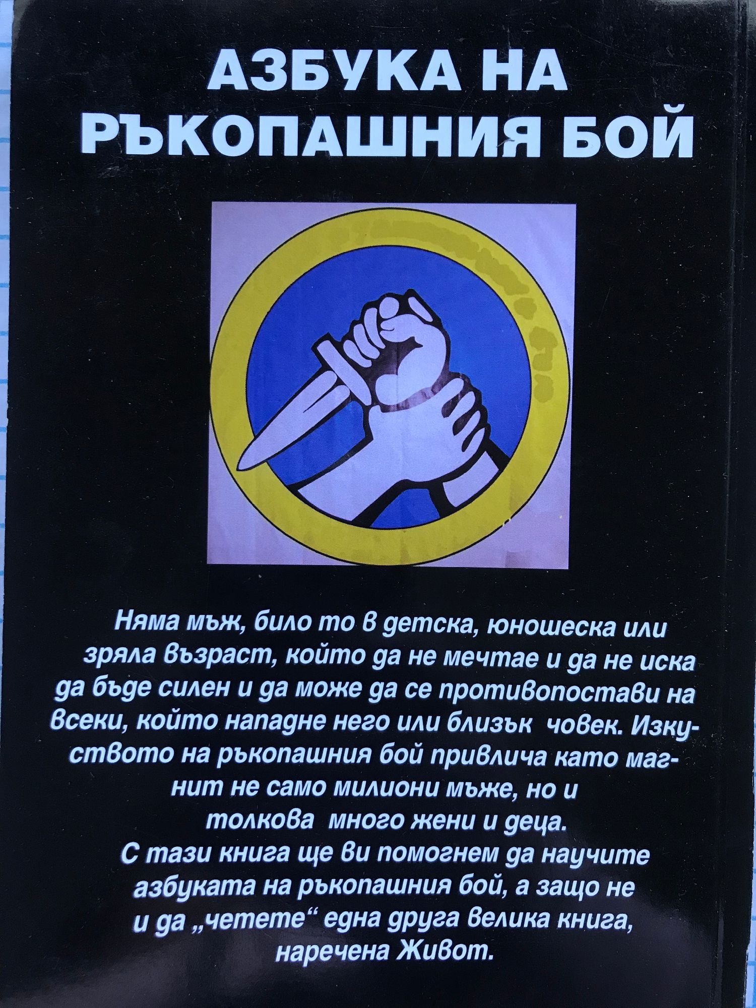 Няма мъж, било то в детска, юношеска или зряла възраст, който да не мечтае и да не иска да бъде силен и да може да се противопостави на всеки, който нападне него или близък човек. Изкуството на ръкопашния бой привлича като магнит не само милиони мъже, но и толкова много жени и деца. С тази книга ще ви помогнем да научите азбуката на ръкопашния бой, а защо не и да "четете" една друга книга, наречена Живот.