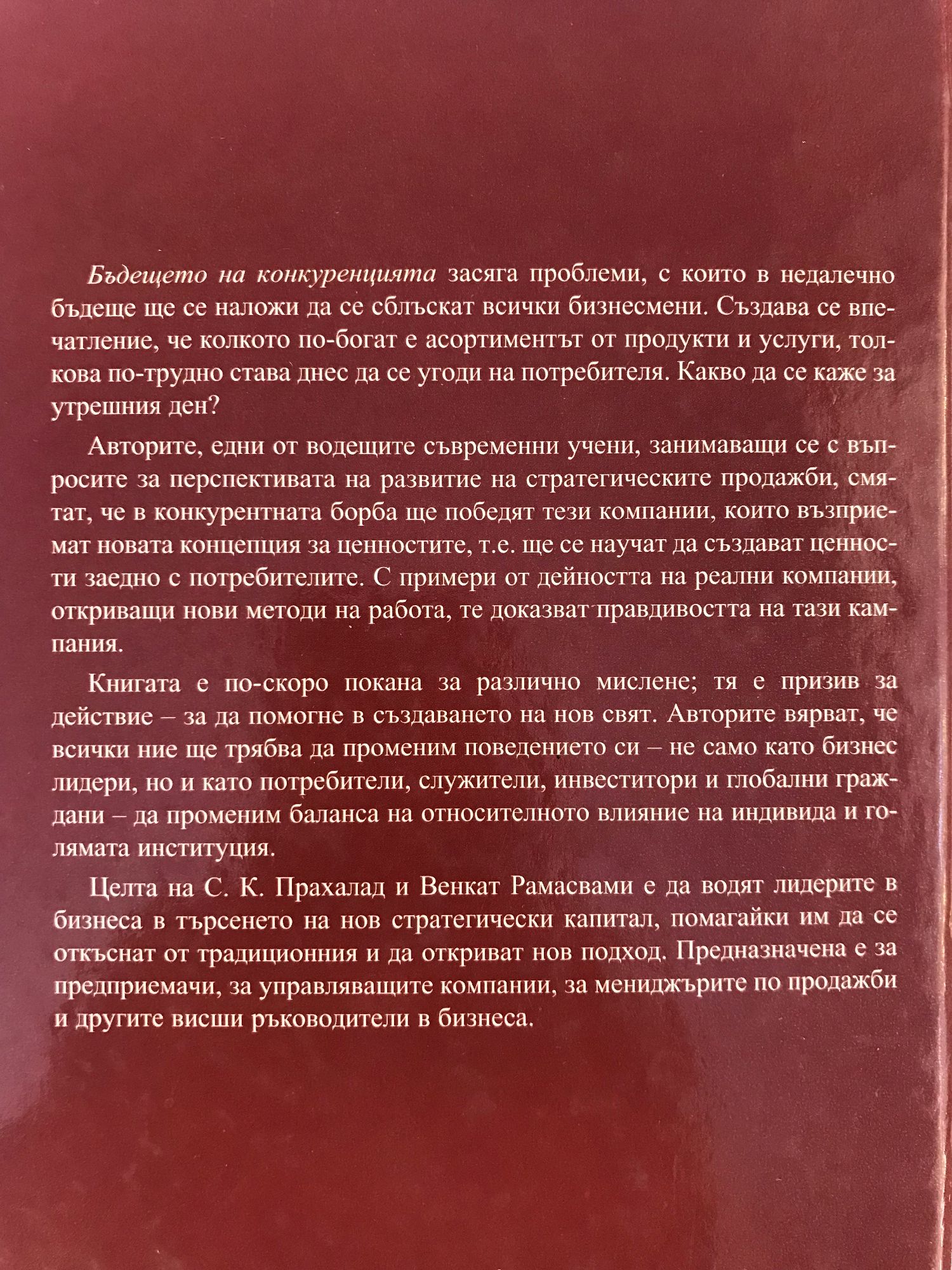 Бъдещето на конкуренцията засяга проблеми, с които в недалечно бъдеще ще се наложи да се сблъскат всички бизнесмени. Създава се впечатление, че колкото по-богат е асортиментът от продукти и услуги, толкова по-трудно става днес да се угоди на потребителя. Какво да се каже за утрешния ден?Авторите, едни от водещите съвременни учени, занимаващи се с въпросите за перспективата на развитие на стратегическите продажби, смятат, че в конкурентната борба ще победят тези компании, които възприемат новата концепция за ценностите, т.е. ще се научат да създават ценности заедно с потребителите. С примери от дейността на реални компании, откриващи нови методи на работа, те доказват правдивостта на тази кампания.Книгата е по-скоро покана за различно мислене; тя е призив за действие — за да помогне в създаването на нов свят. Авторите вярват, че всички ние ще трябва да променим поведението си - не само като бизнес лидери, но и като потребители, служители, инвеститори и глобални граждани - да променим баланса на относителното влияние на индивида и голямата институция.Целта на С. К. Прахалад и Венкат Рамасвами е да водят лидерите в бизнеса в търсенето на нов стратегически капитал, помагайки им да се откъснат от традиционния и да откриват нов подход. Предназначена е за предприемачи, за управляващите компании, за мениджърите по продажби и другите висши ръководители в бизнеса.