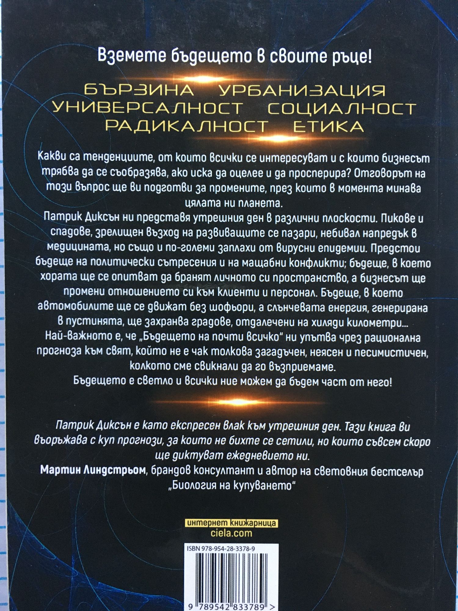 Бъдещето е светло и всички ние можем да бъдем част от него - разбери как от книгата на Патрик Диксън Патрик Диксън е като експресен влак към утрешния ден. Тази книга ви въоръжава с куп прогнози, за които не бихте се сетили, но които съвсем скоро ще диктуват ежедневието ни. Мартин Линдстрьом, брандов консултант и автор на световния бестселър „Биология на купуването“ Вземете бъдещето в своите ръце Бързина. Урбанизация. Универсалност. Социалност. Радикалност. Етика. Какви са тенденциите, от които всички се интересуват и с които бизнесът трябва да се съобразява, ако иска да оцелее и да просперира? Отговорът на този въпрос ще ви подготви за промените, през които в момента минава цялата ни планета. Патрик Диксън ни представя утрешния ден в различни плоскости. Пикове и спадове, зрелищен възход на развиващите се пазари, небивал напредък в медицината, но също и по-големи заплахи от вирусни епидемии. Предстои бъдеще на политически сътресения и на мащабни конфликти; бъдеще, в което хората ще се опитват да бранят личното си пространство, а бизнесът ще промени отношението си към клиенти и персонал. Бъдеще, в което автомобилите ще се движат без шофьори, а слънчевата енергия, генерирана в пустинята, ще захранва градове, отдалечени на хиляди километри… Най-важното обаче е, че „Бъдещето на почти всичко“ ни упътва чрез рационална прогноза към свят, който не е чак толкова загадъчен, неясен и песимистичен, колкото сме свикнали да го възприемаме