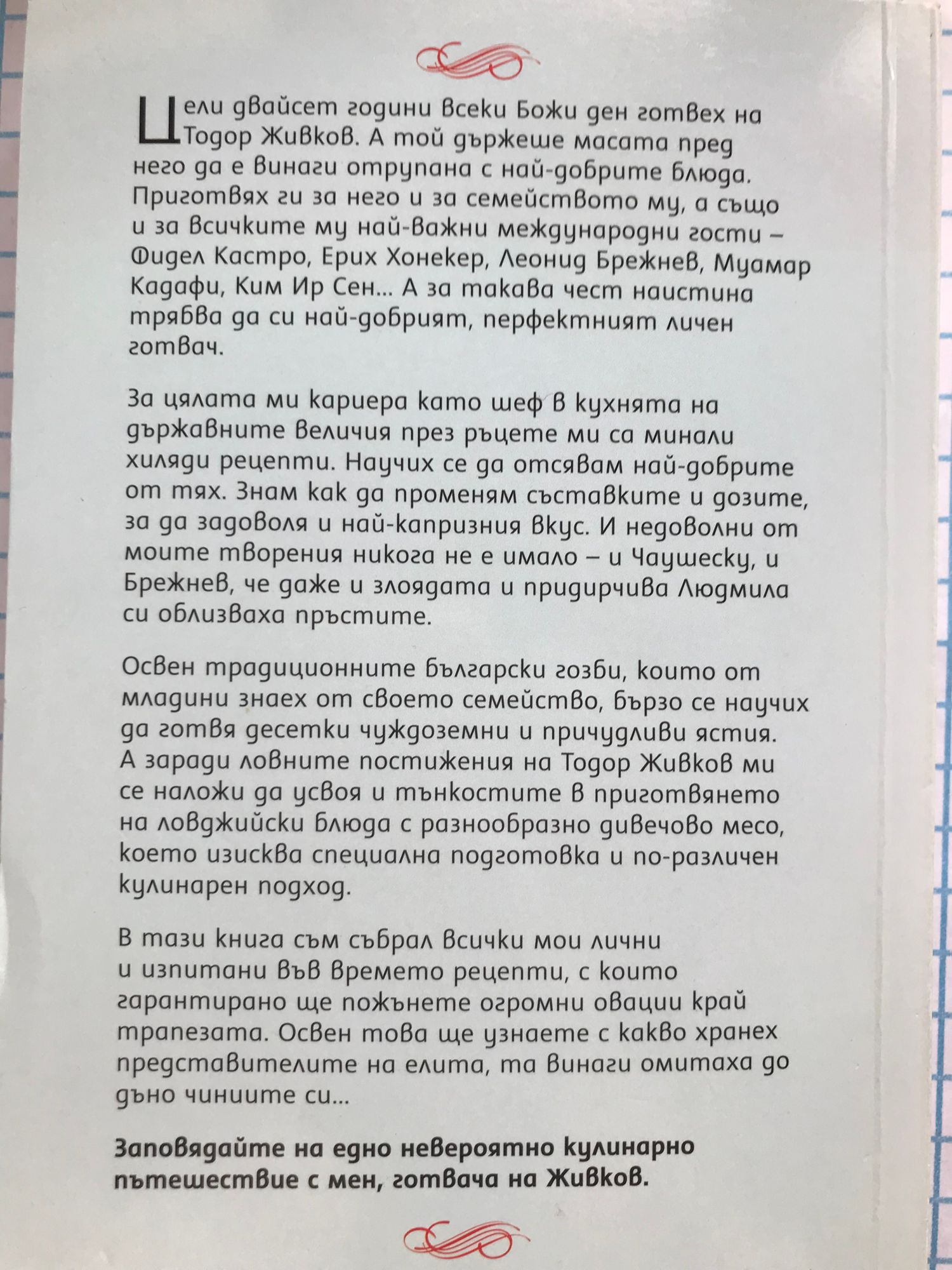 Поемете на едно невероятно гастрономическо пътешествие с готвача на Тодор Живков, Бай Данчо. Юбилейното издание "Всички мои рецепти" събира на едно място цялото кулинарно богатство на Йордан Стоичков, известен като главния готвач на бившия Първи. В него ще намерите повече от 300 от най-изисканите и изпитани авторски рецепти, изпитани през годините от Бай Данчо, но едновременно с това и съобразени с модерните тенденции и технологии, които ще намерите във всяка съвременна кухня. За улеснение на читателя чудните гозби в книгата са подредени в раздели - салати, супи и чорби, предястия, постни ястия, ястия с: риба, птиче, агнешко, със свинско, телешко месо, кайма и дивеч, баници, качамаци и каши, сосове и маринати и десерти.