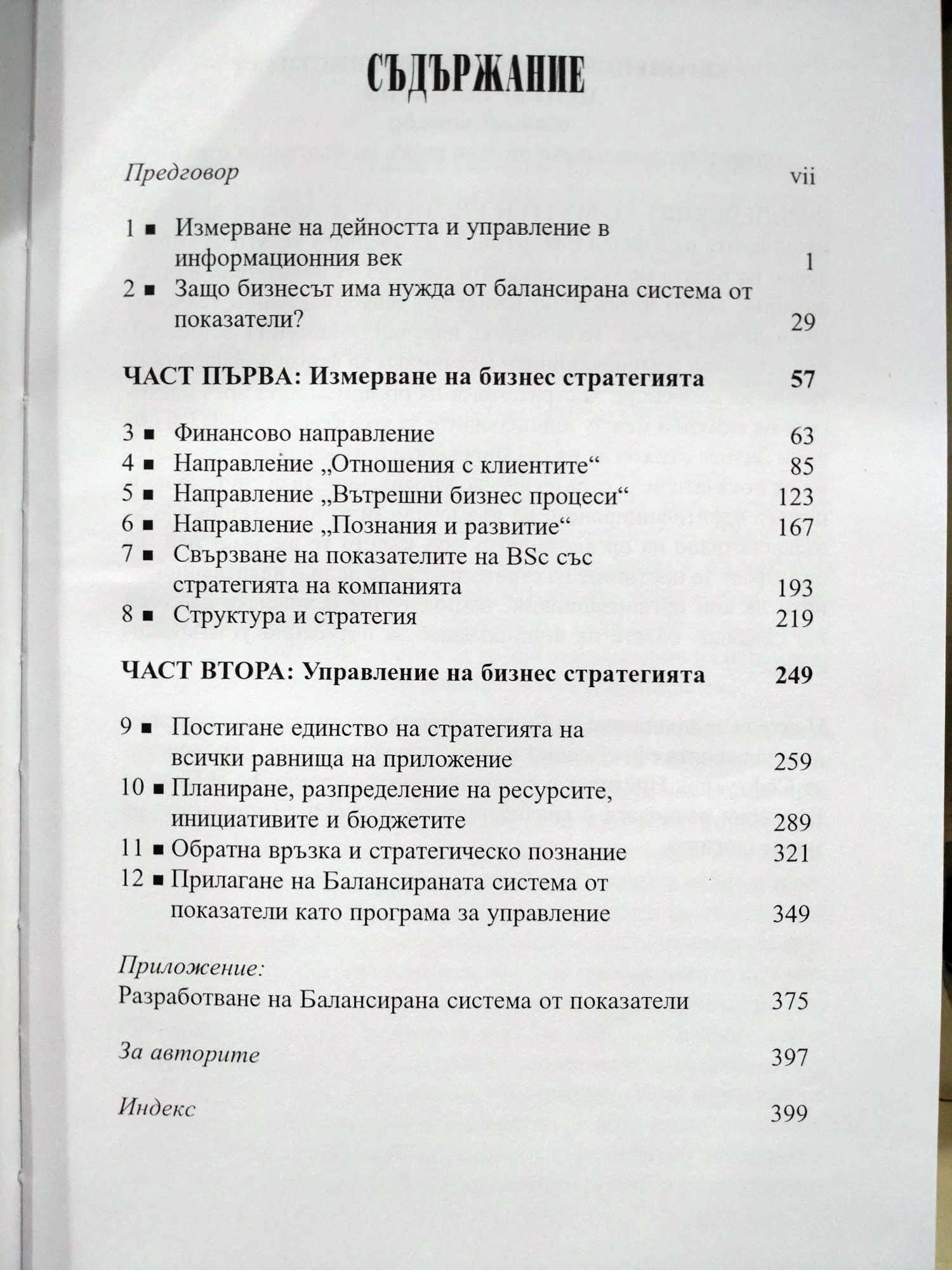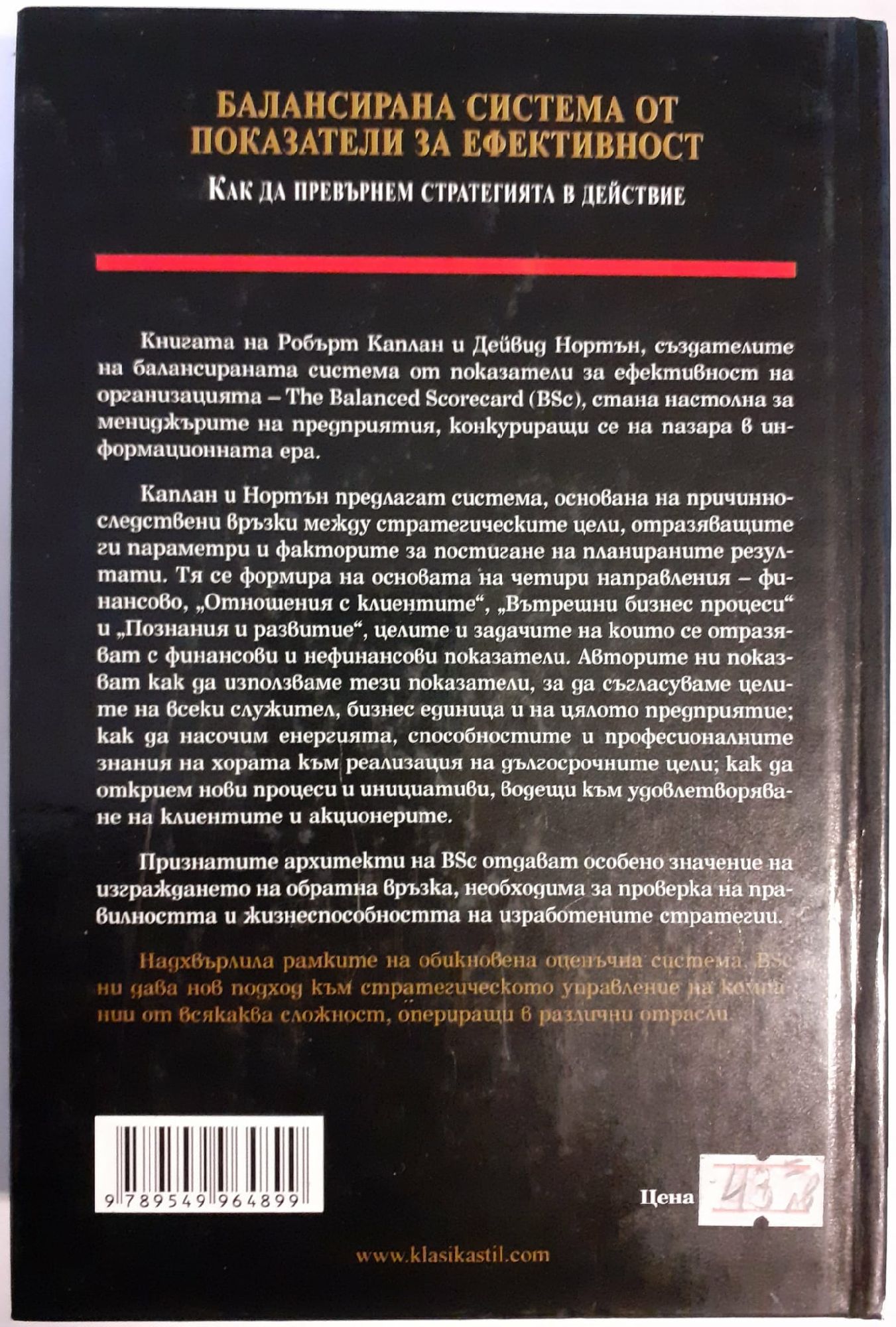 Книгата на Робърт Каплан и Дейвид Нортън, създателите на балансираната система от показатели за ефективност на организацията - Balanced Scorecard (BSc), стана настолна за мениджърите на предприятия, конкуриращи се на пазара в информационната ера. Каплан и Нортън предлагат система, основана на причинно-следствени връзки между стратегическите цели, отразяващите ги параметри и факторите за постигане на планираните резултати. Тя се формира на основата на четири направления - финансово, "Отношения с клиентите", "Вътрешни бизнес процеси" и "Познания и развитие", целите и задачите на които се отразяват с финансови и нефинансови показатели.