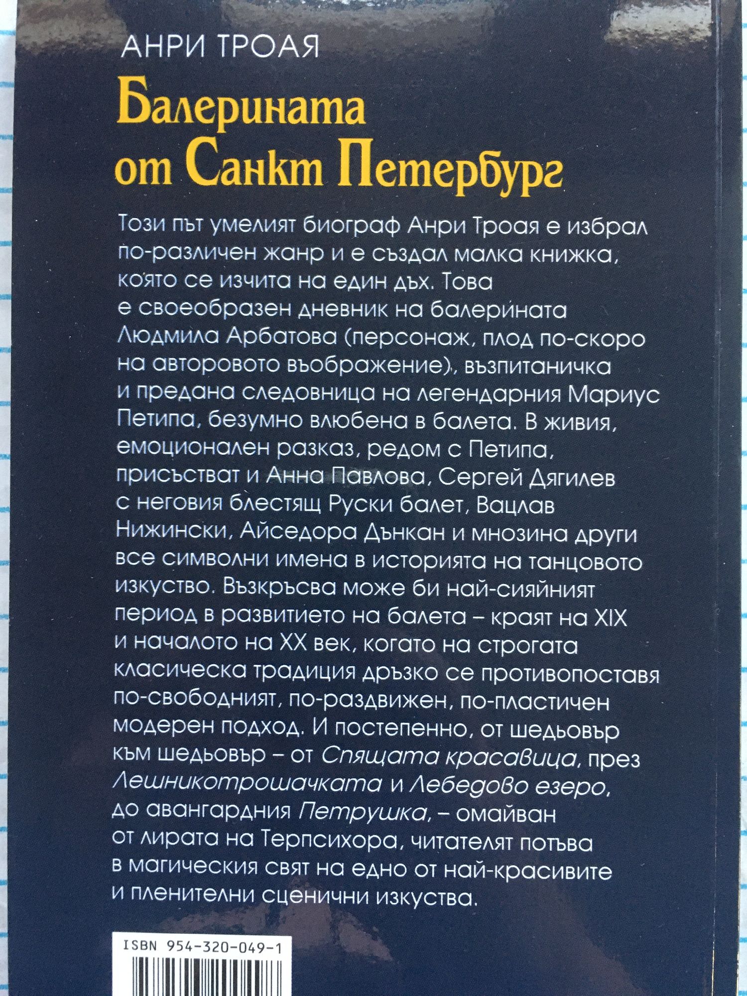 Този път умелият биограф Анри Троая е избрал по-различен жанр и е създал малка книжка, която се изчита на един дъх. Това е своеобразен дневник на балерината Людмила Арбатова (персонаж, плод по-скоро на авторовото въображение), възпитаничка и предана следовница на легендарния Мариус Петипа, безумно влюбена в балета. В живия, емоционален разказ, редом с Петипа, присъстват и Анна Павлова, Сергей Дягилев с неговия блестящ Руски балет, Вацлав Нижински, Айседора Дънкан и мнозина други все символни имена в историята на танцовото изкуство. Възкръсва може би най-сияйният период в развитието на балета - краят на XIX и началото на XX век, когато на строгата класическа традиция дръзко се противопоставя по-свободният, по-раздвижен, по-пластичен модерен подход. И постепенно, от шедьовър към шедьовър - от Спящото красавица, през Лешникотрошачката и Лебедово езеро, до авангардния Петрушка, - омайван от лирата на Терпсихора, читателят потъва в магическия свят на едно от най-красивите и пленителни сценични изкуства.